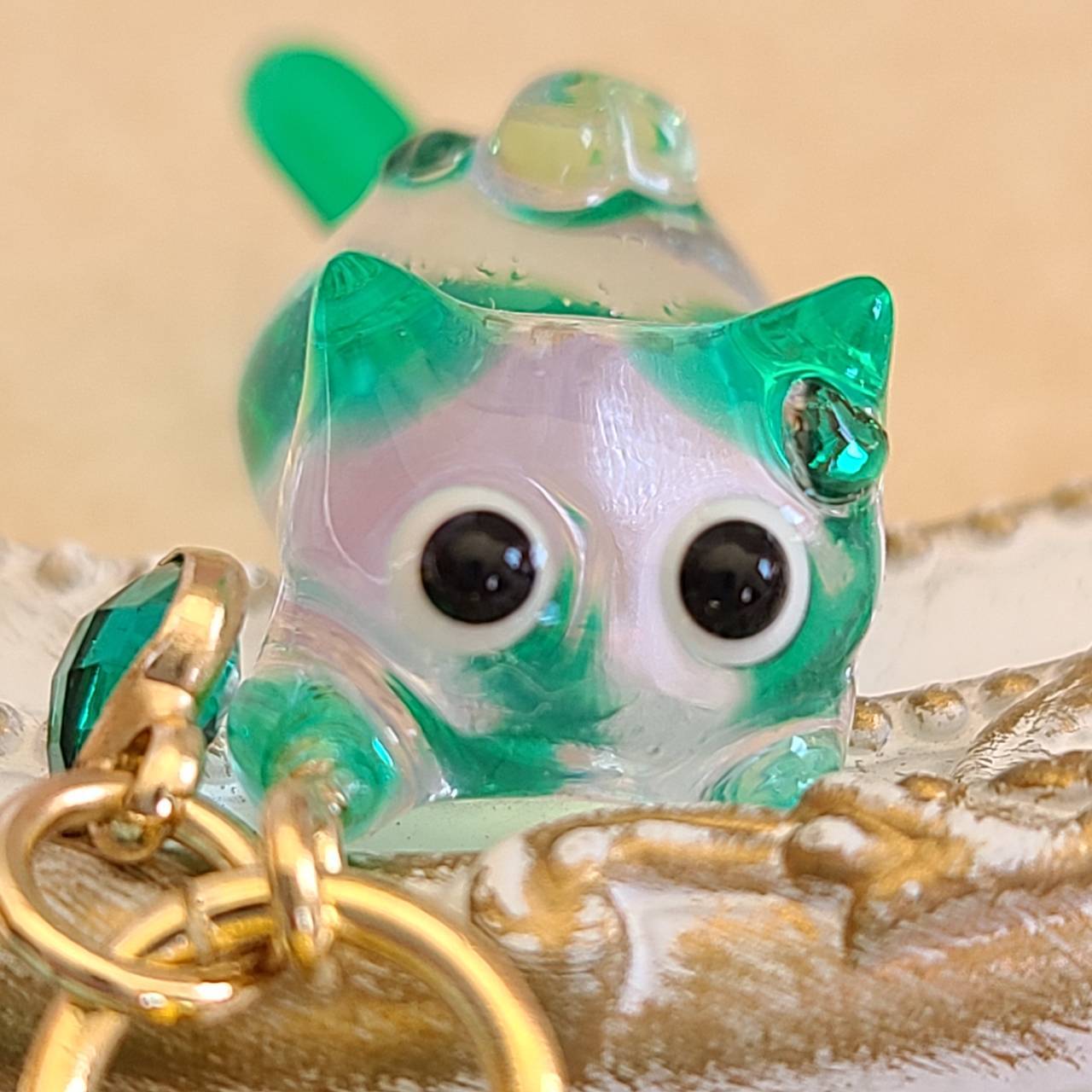 グリーンをポイントにしたクリアなネコちゃんがぷっくりしたエメラルドグリーンのハートを纏っています。