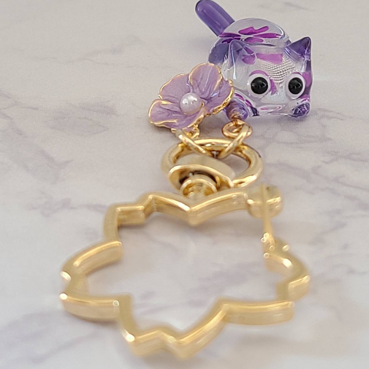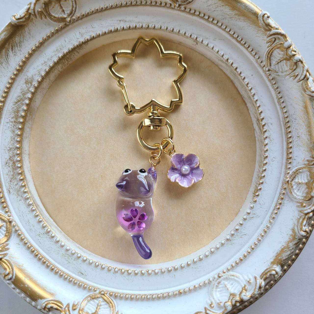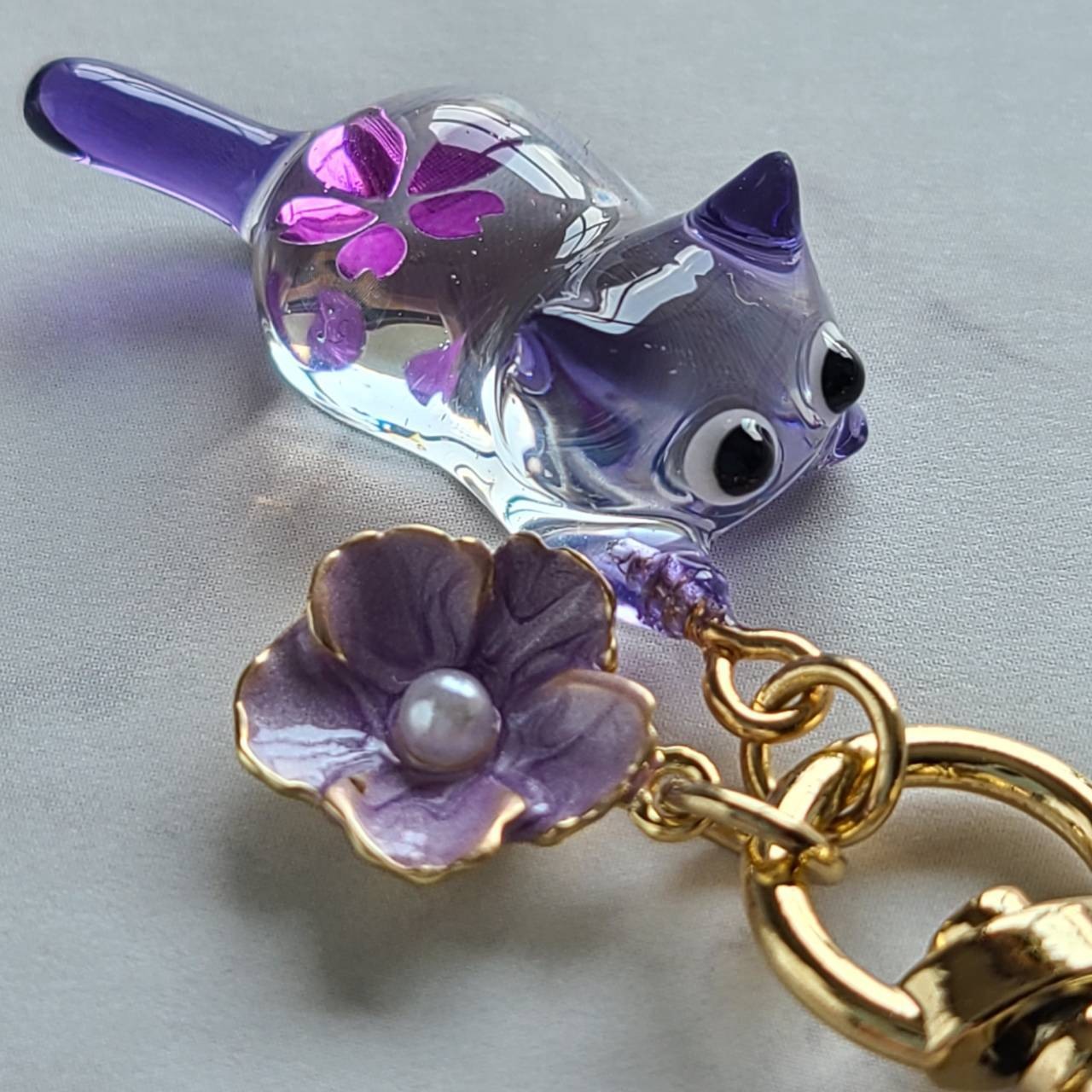 【受注販売】紫の桜にゃんこのキーホルダー❉パープルの桜のチャーム付き