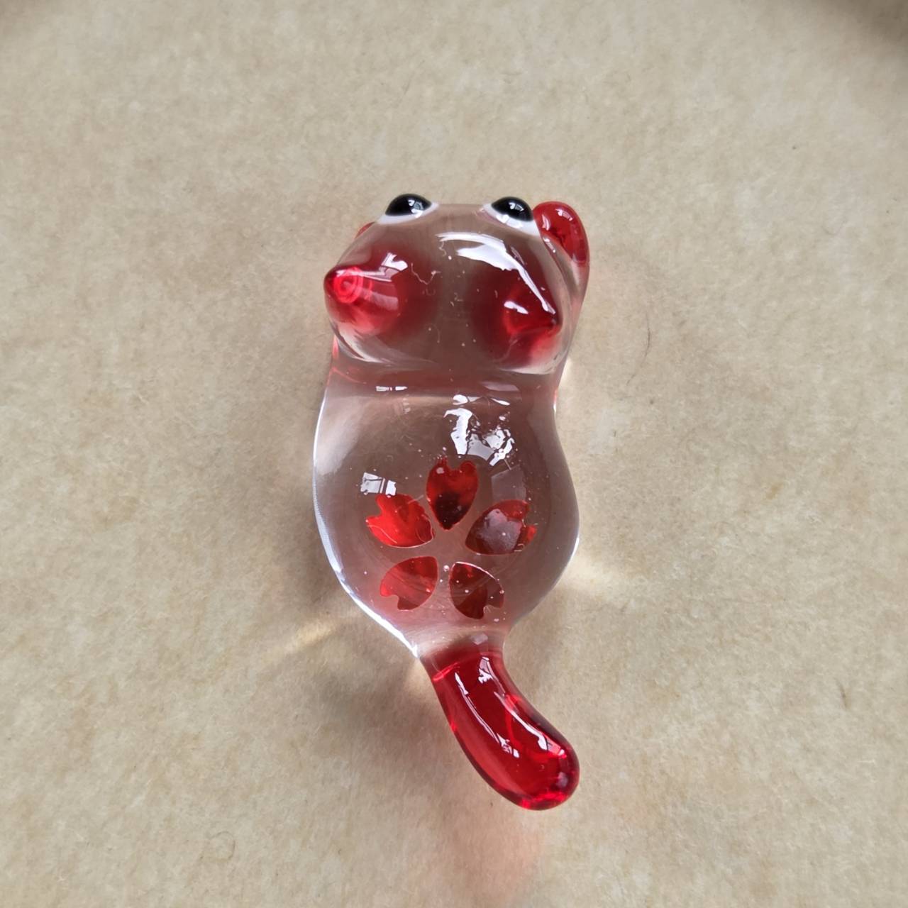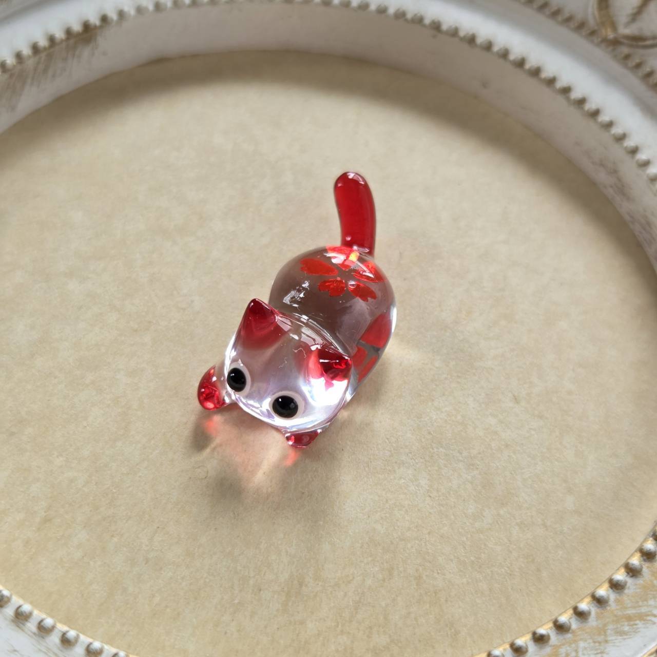 赤をポイントにしたクリアなネコちゃんの中に真っ赤な桜の花を一輪閉じ込めました。