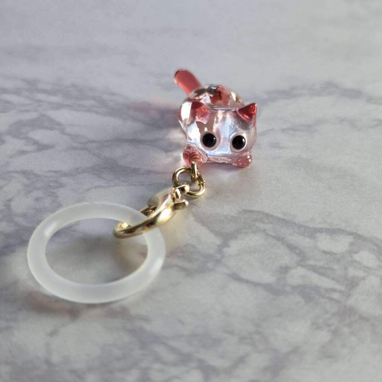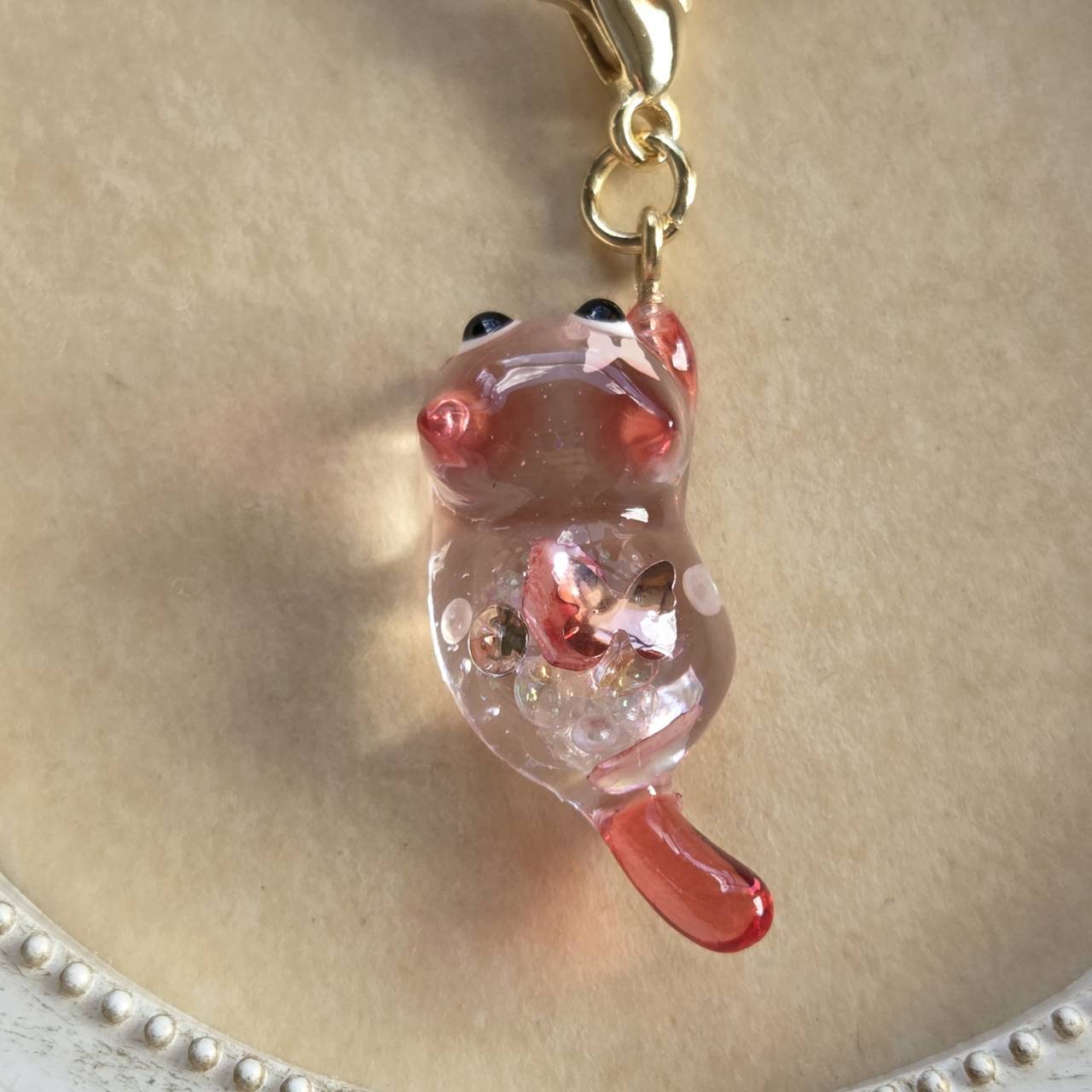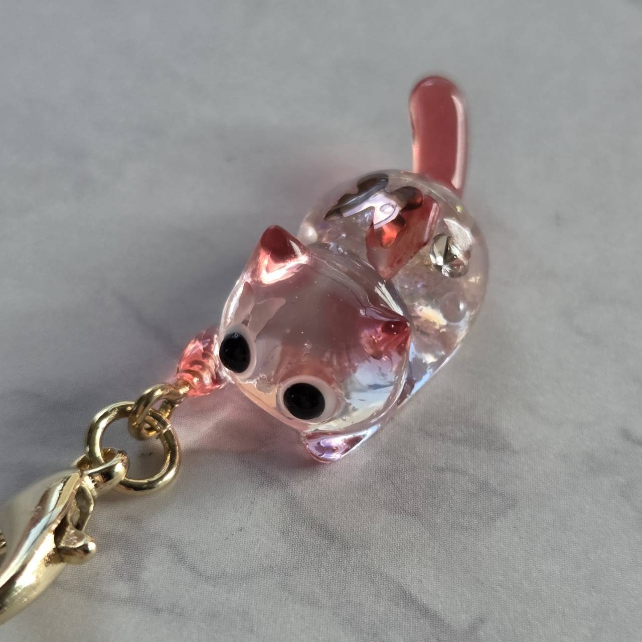 薔薇色をポイントにしたクリアなネコちゃんの中に淡いピンクの蝶やビシューが詰め込まれています。