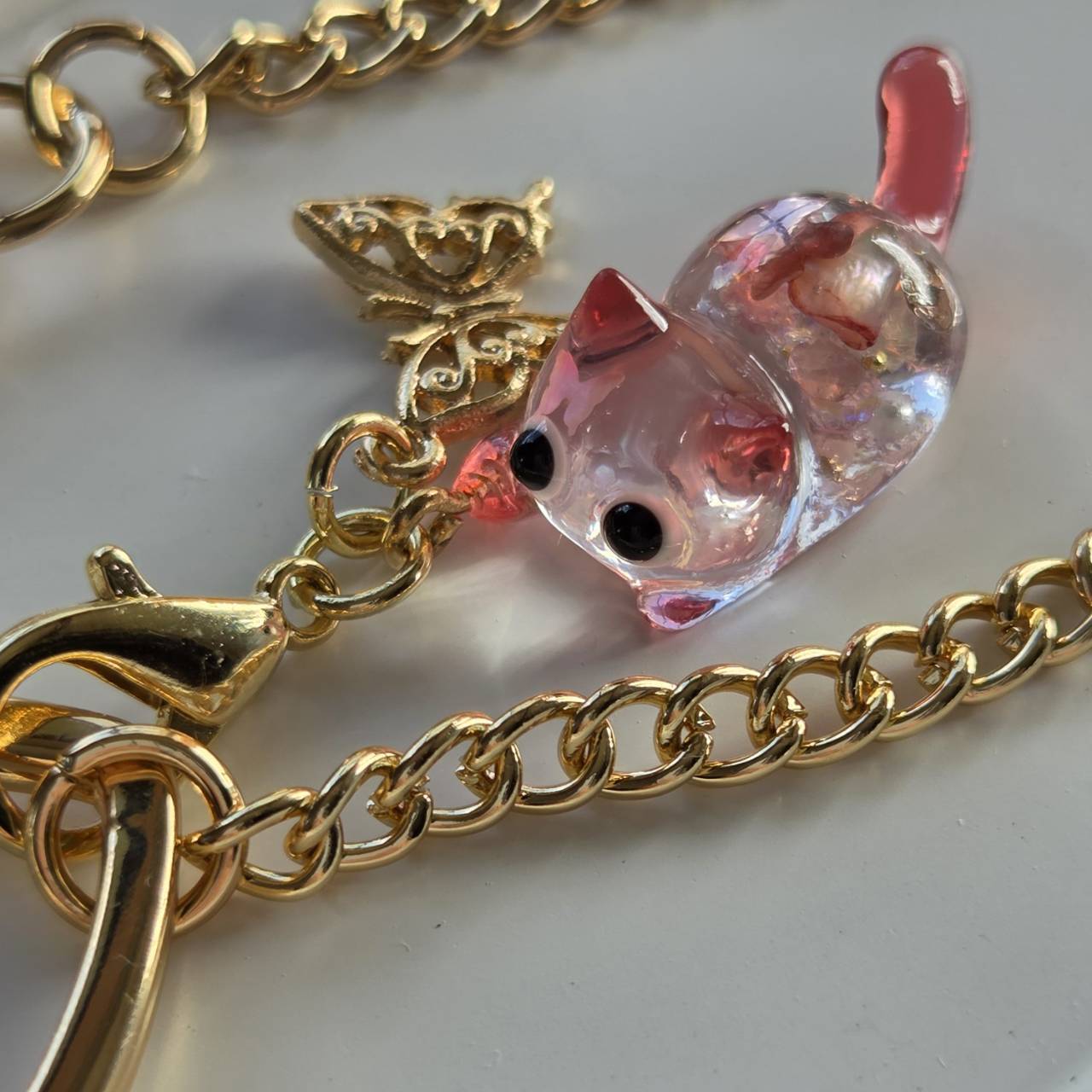 薔薇色をポイントにしたクリアなネコちゃんの中に淡いピンクの蝶やビシューが詰め込まれています。