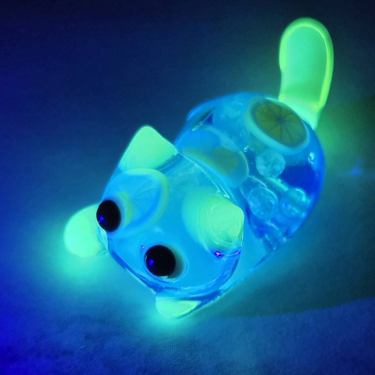 また、ねこちゃんの中にはレモンの輪切りや蓄光ブリオンが詰め込まれているので、暗い所でも光ります。