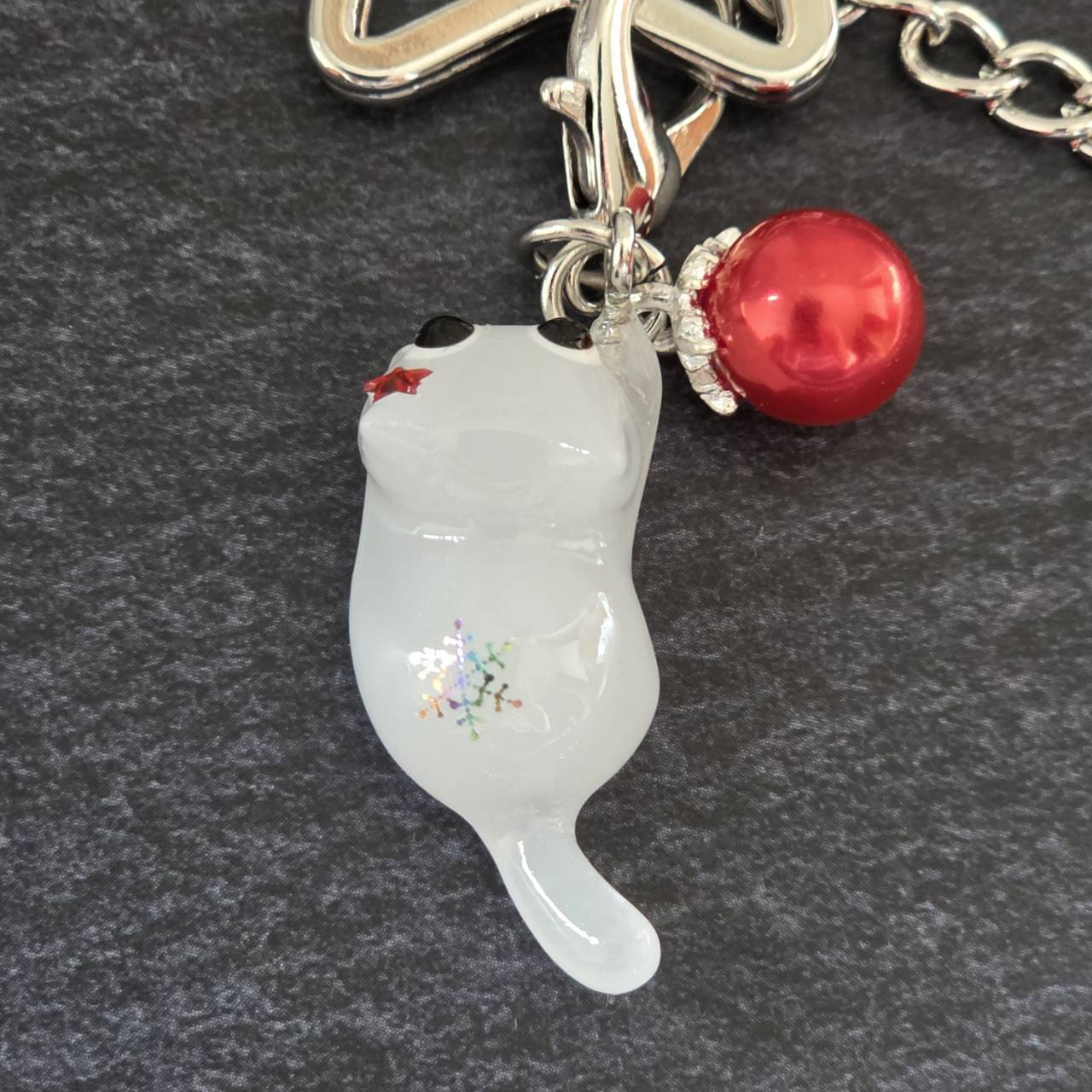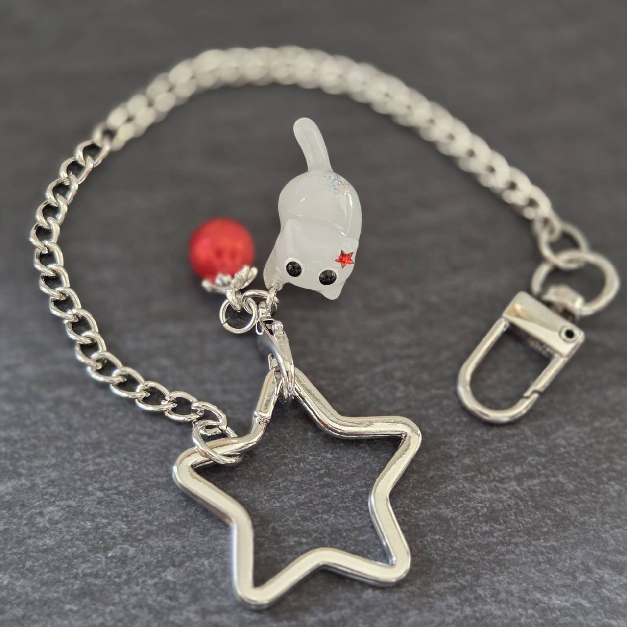 【受注販売】白猫の星型バッグチャーム(シルバー)❉赤いクリスマスボールのチャーム付き