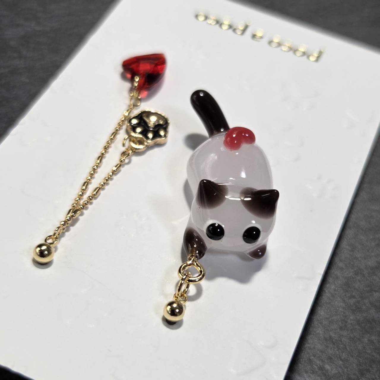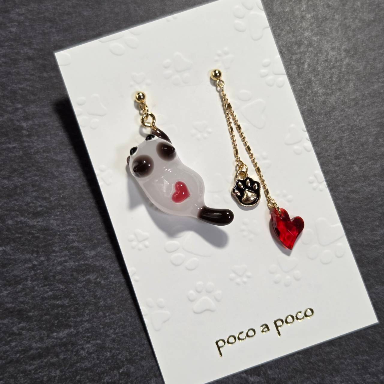 【受注販売】ピアス❉お鼻のブチ無し!ぷっくり赤いハートを纏ったシャム猫とハートと肉球のチャーム