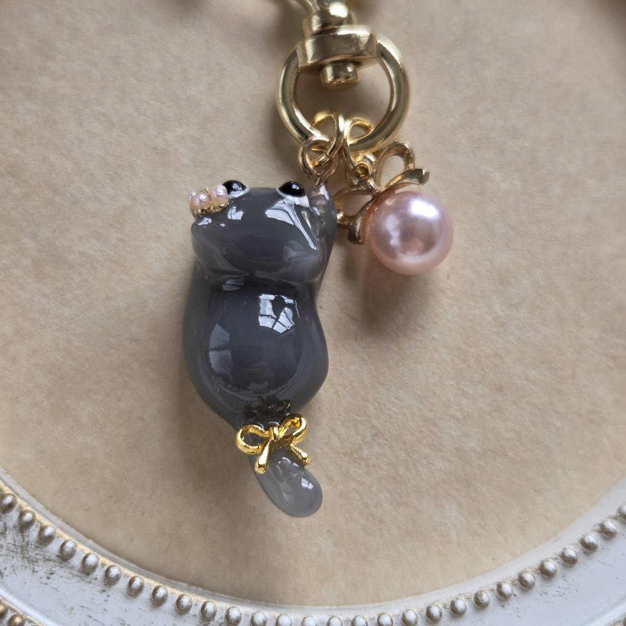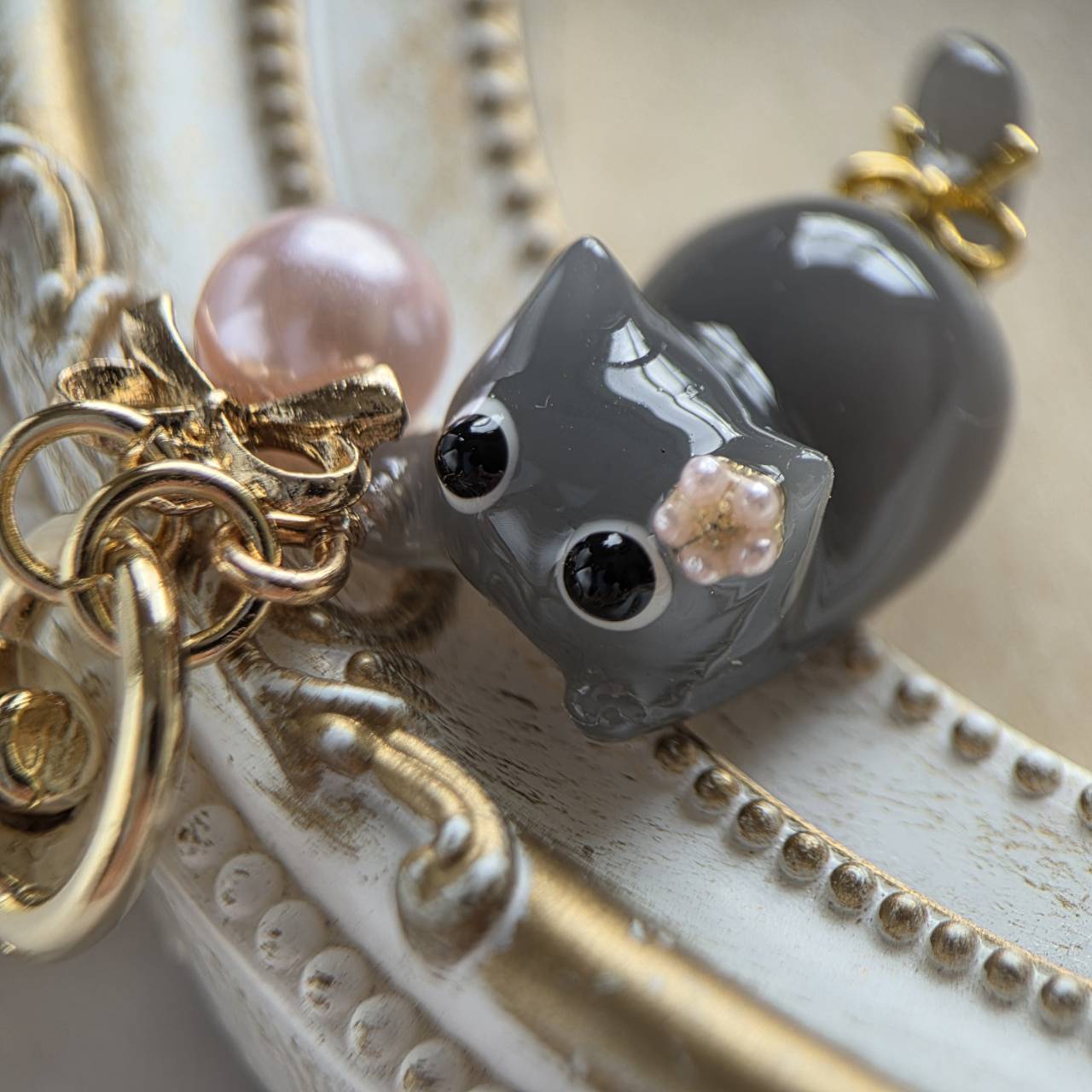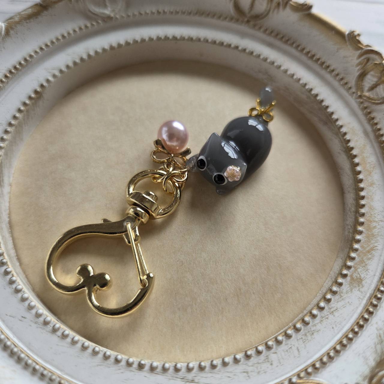 【受注販売】黒いお目目のロシアンブルーのキーホルダー❉ピンクパールのチャーム付き