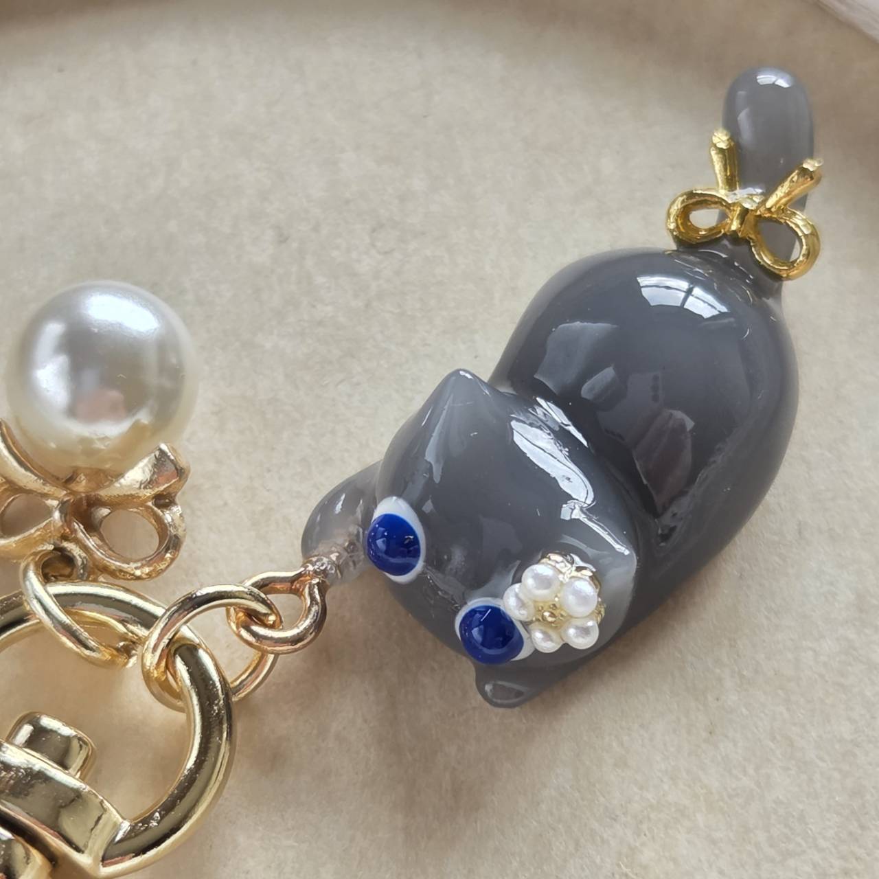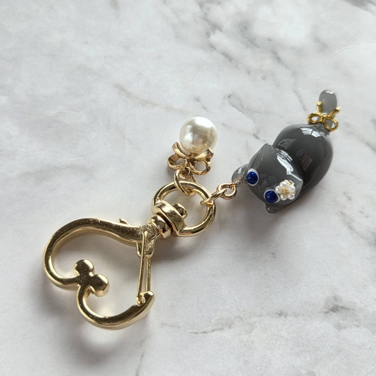 【受注販売】青いお目目のロシアンブルーのキーホルダー❉ホワイトパールのチャーム付き