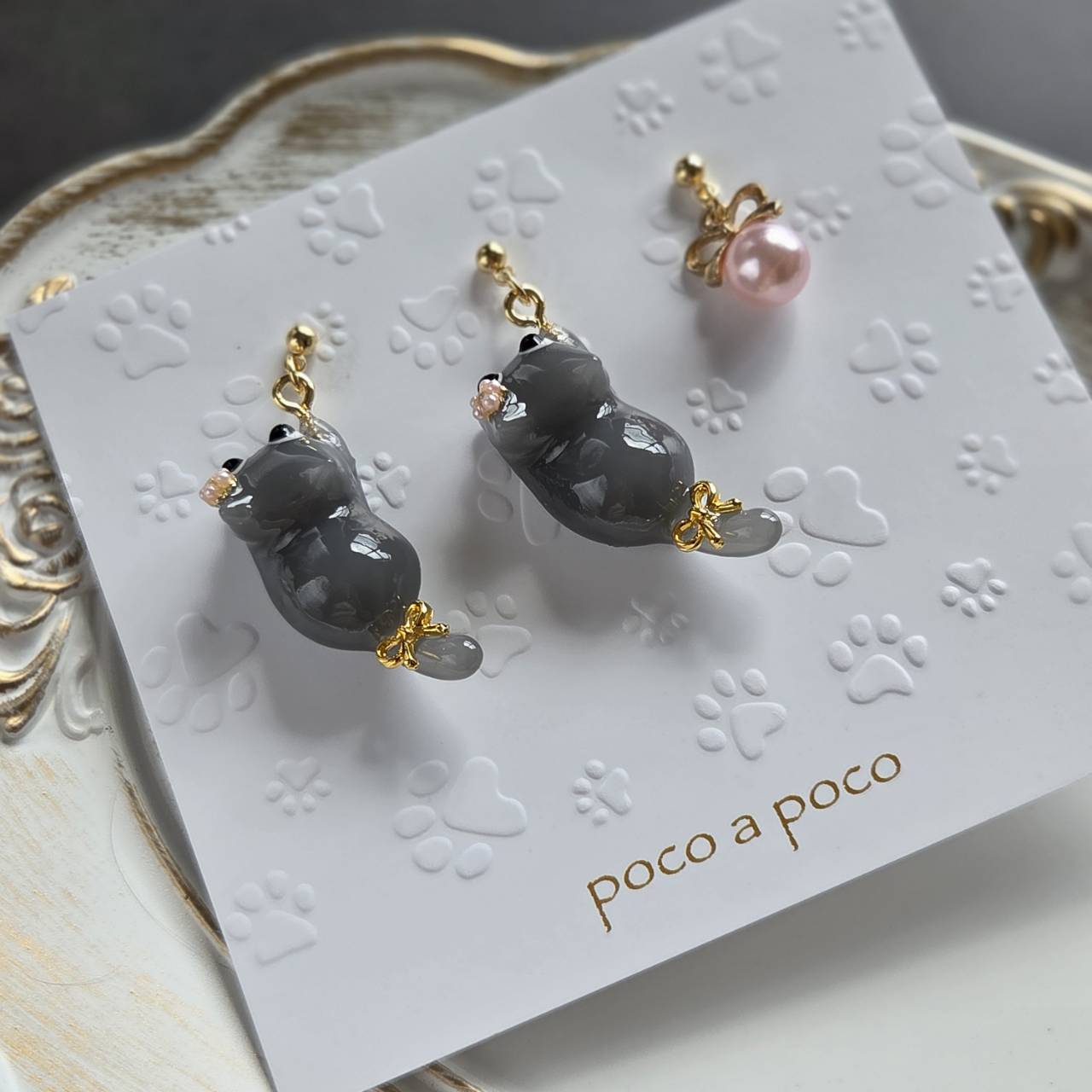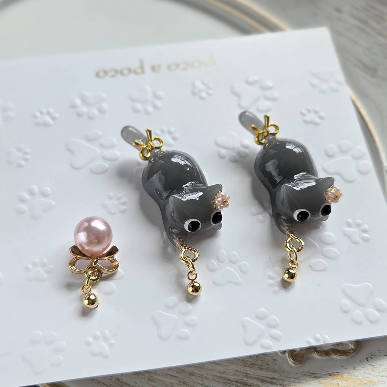 【受注販売】ピアス❉黒いお目目のロシアンブルー2匹とピンクパールのチャーム