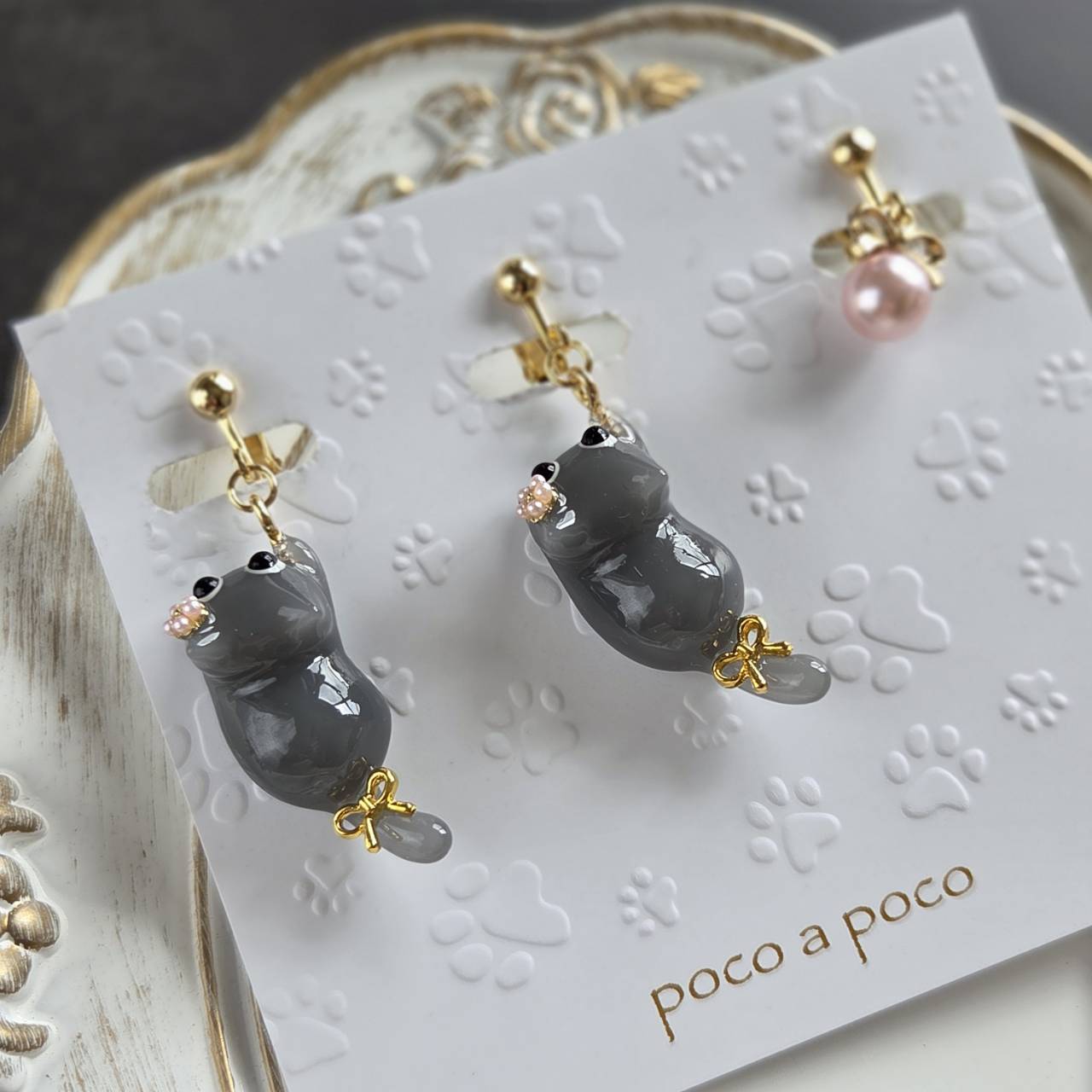 【受注販売】イヤリング❉黒いお目目のロシアンブルー2匹とピンクパールのチャーム
