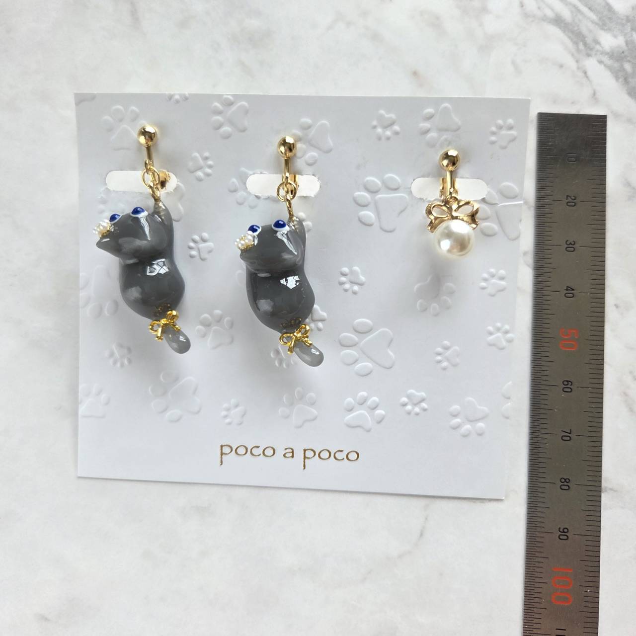 【受注販売】イヤリング❉青いお目目のロシアンブルー2匹とホワイトパールのチャーム