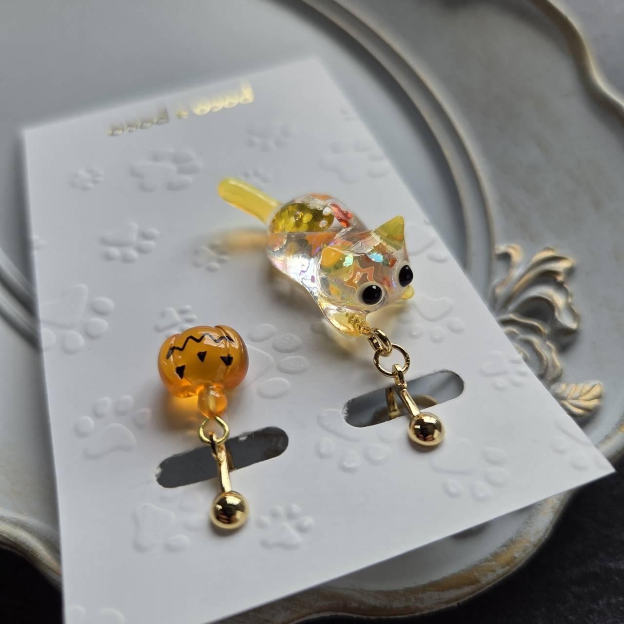 【受注販売】イヤリング❉光る!オレンジのハロウィンにゃんこ❉カボチャのチャーム