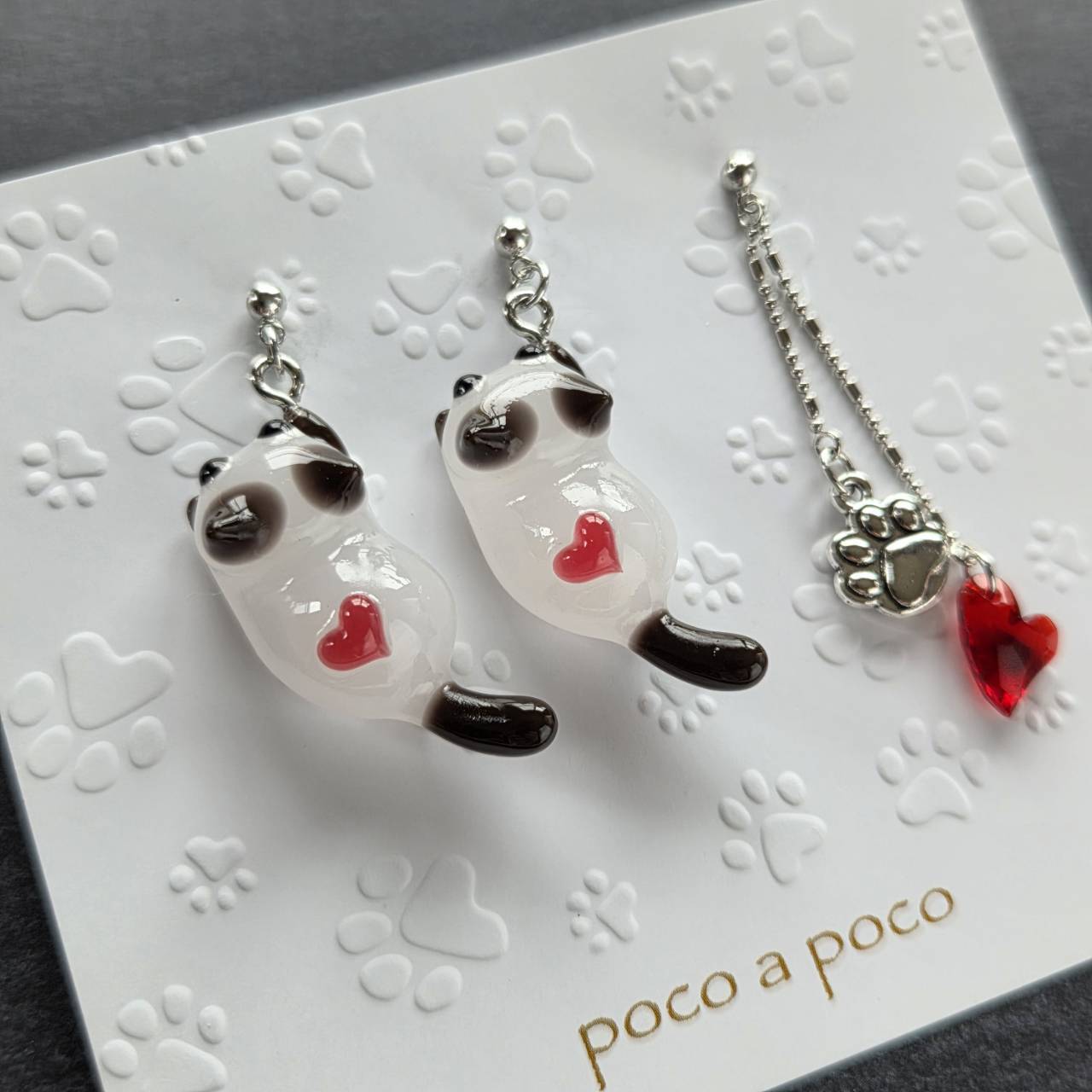 【受注販売】ピアス❉シルバー❉お鼻のブチ無し!ぷっくり赤いハートを纏ったシャム猫2匹とハートと肉球のチャーム