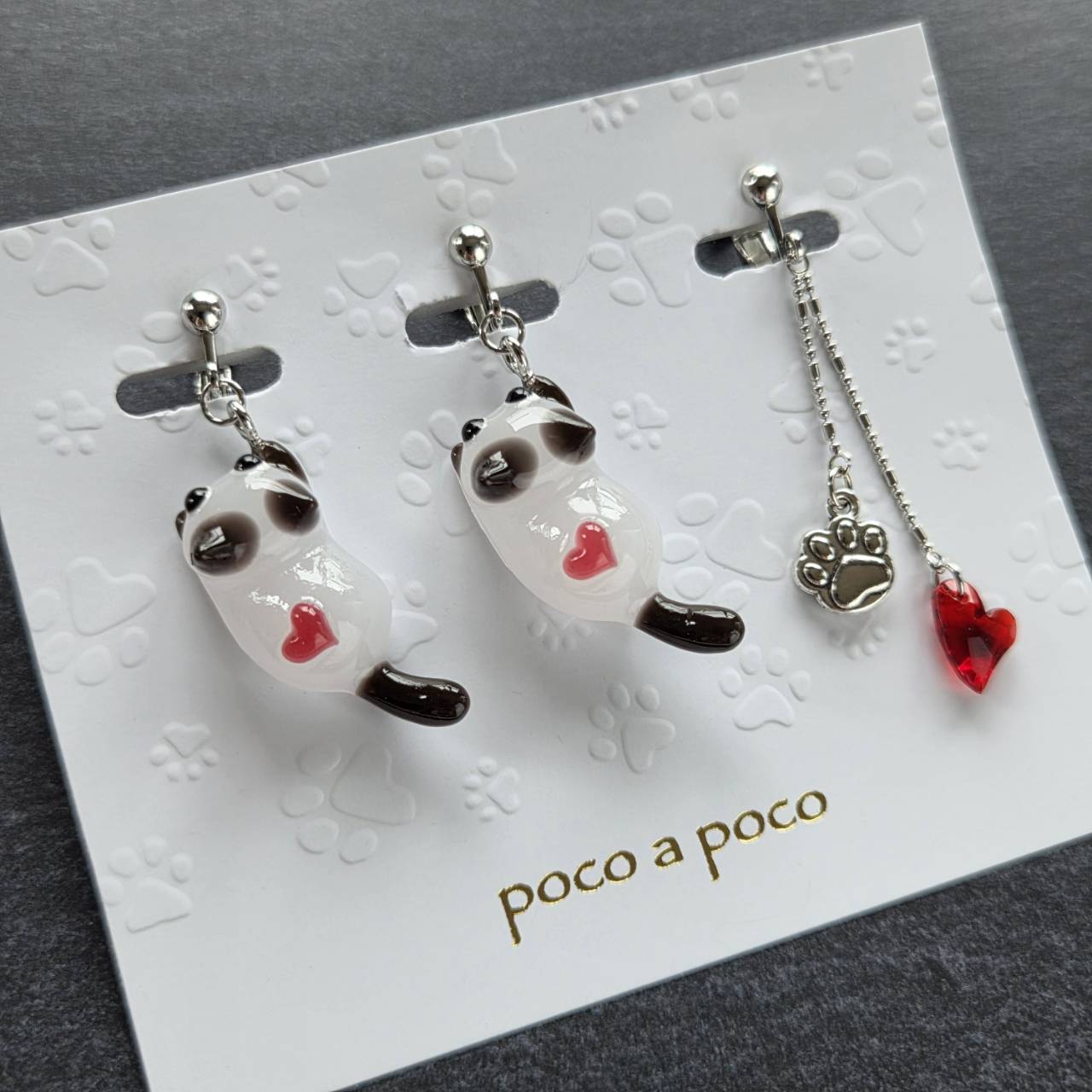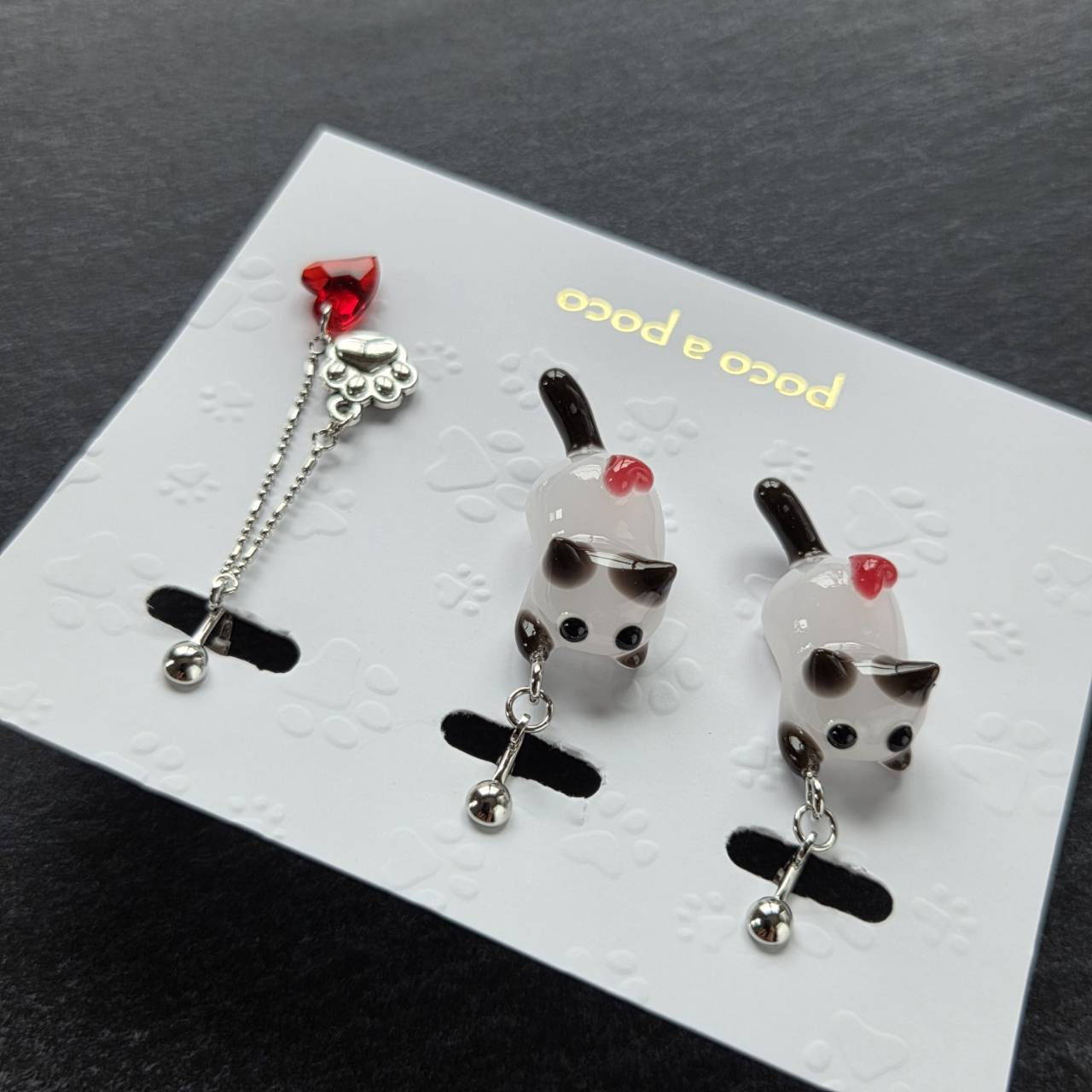 【受注販売】イヤリング❉シルバー❉お鼻のブチ無し!ぷっくり赤いハートを纏ったシャム猫2匹とハートと肉球のチャーム