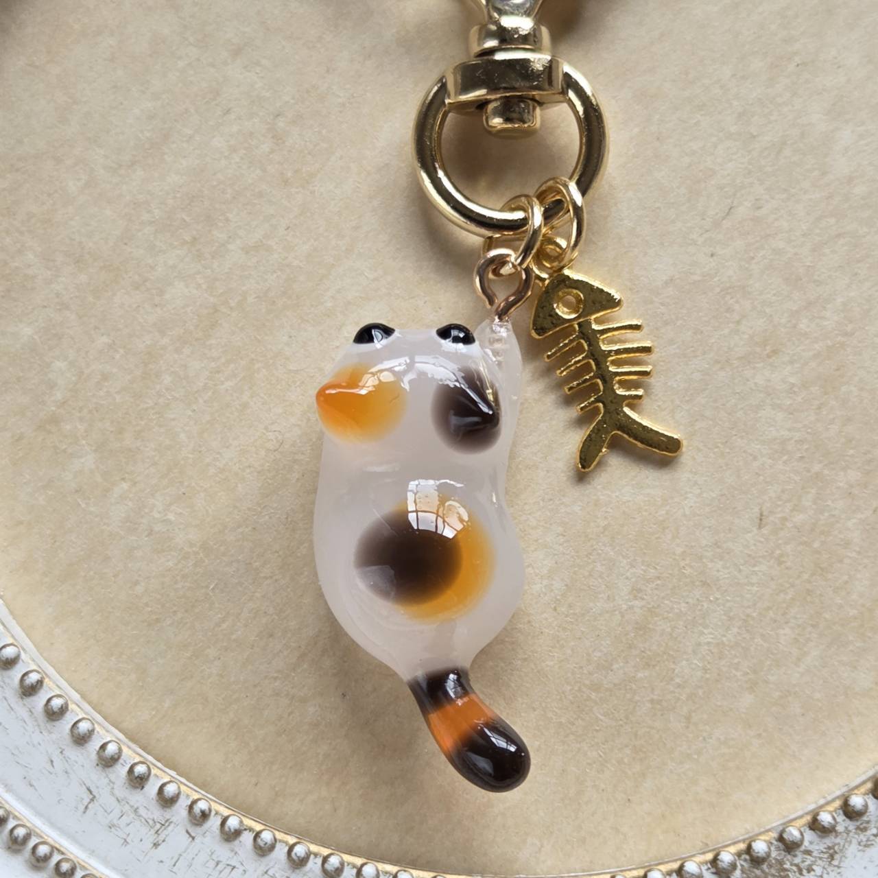 【受注販売】ミケ猫のハートキーホルダー(ゴールド)❉魚の骨のチャーム付き