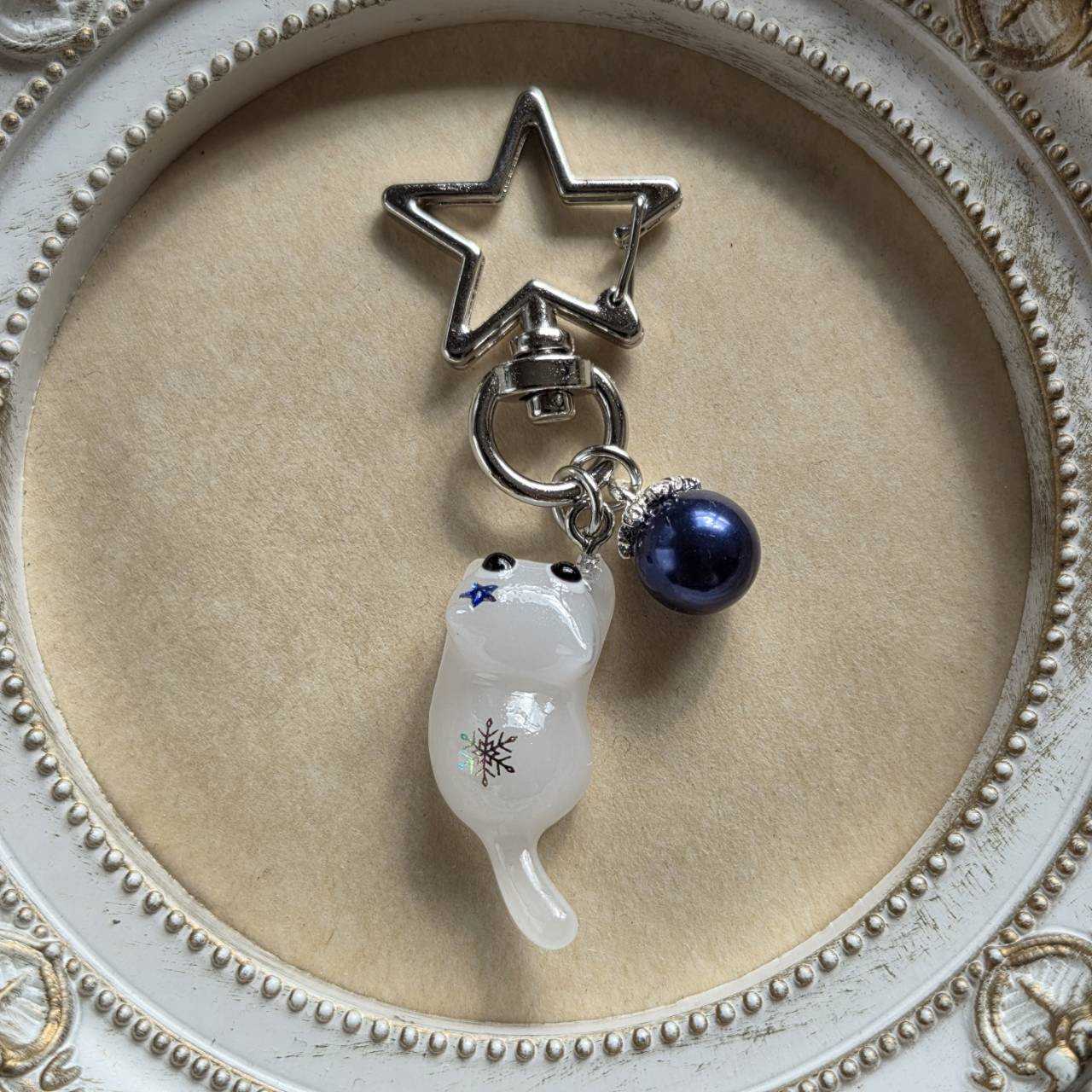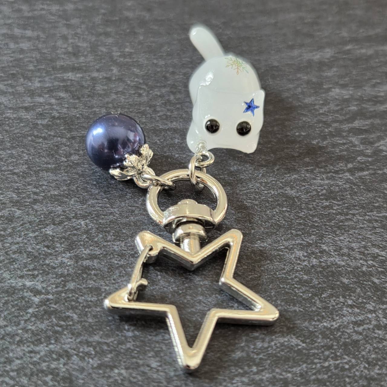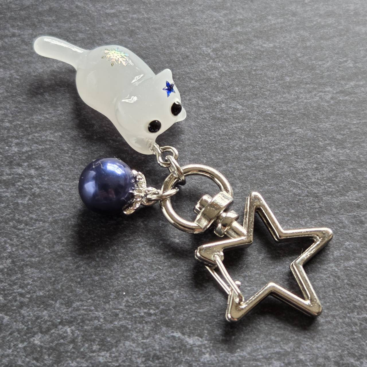 【受注販売】白猫の星型キーホルダー(シルバー)❉青いクリスマスボールのチャーム付き