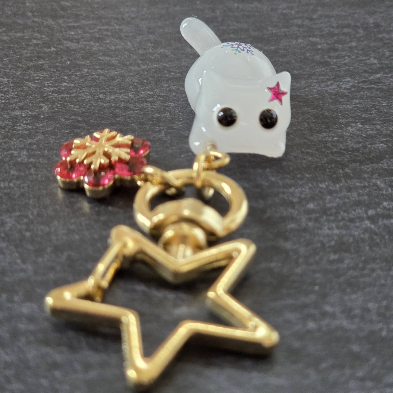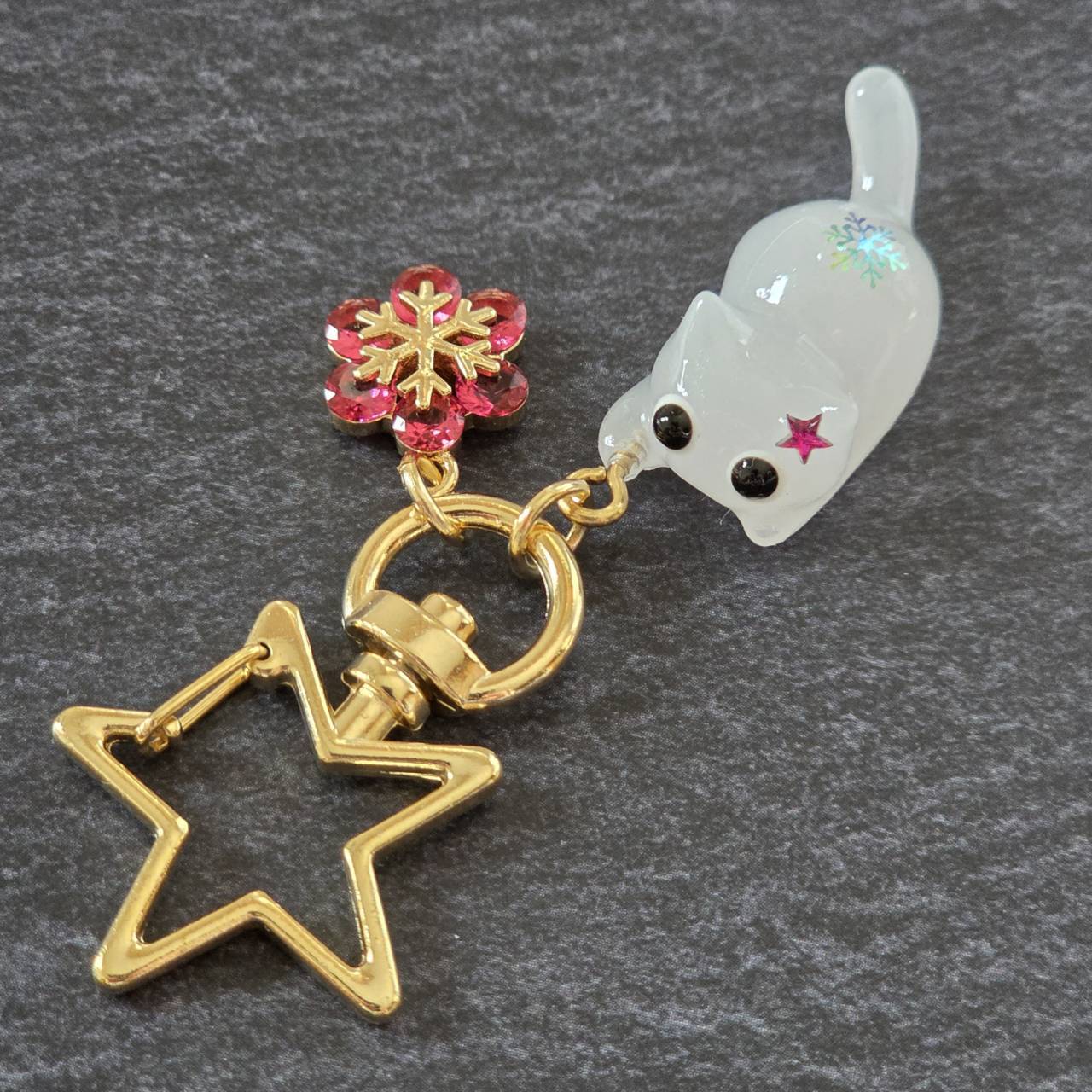 【受注販売】白猫の星型キーホルダー(ゴールド)❉ローズピンクの雪の結晶のチャーム付き