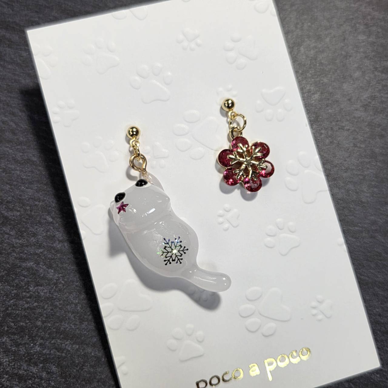 【受注販売】ピアス&イヤリング❉クリスマスの白猫❉ローズピンクの雪の結晶のチャーム付き