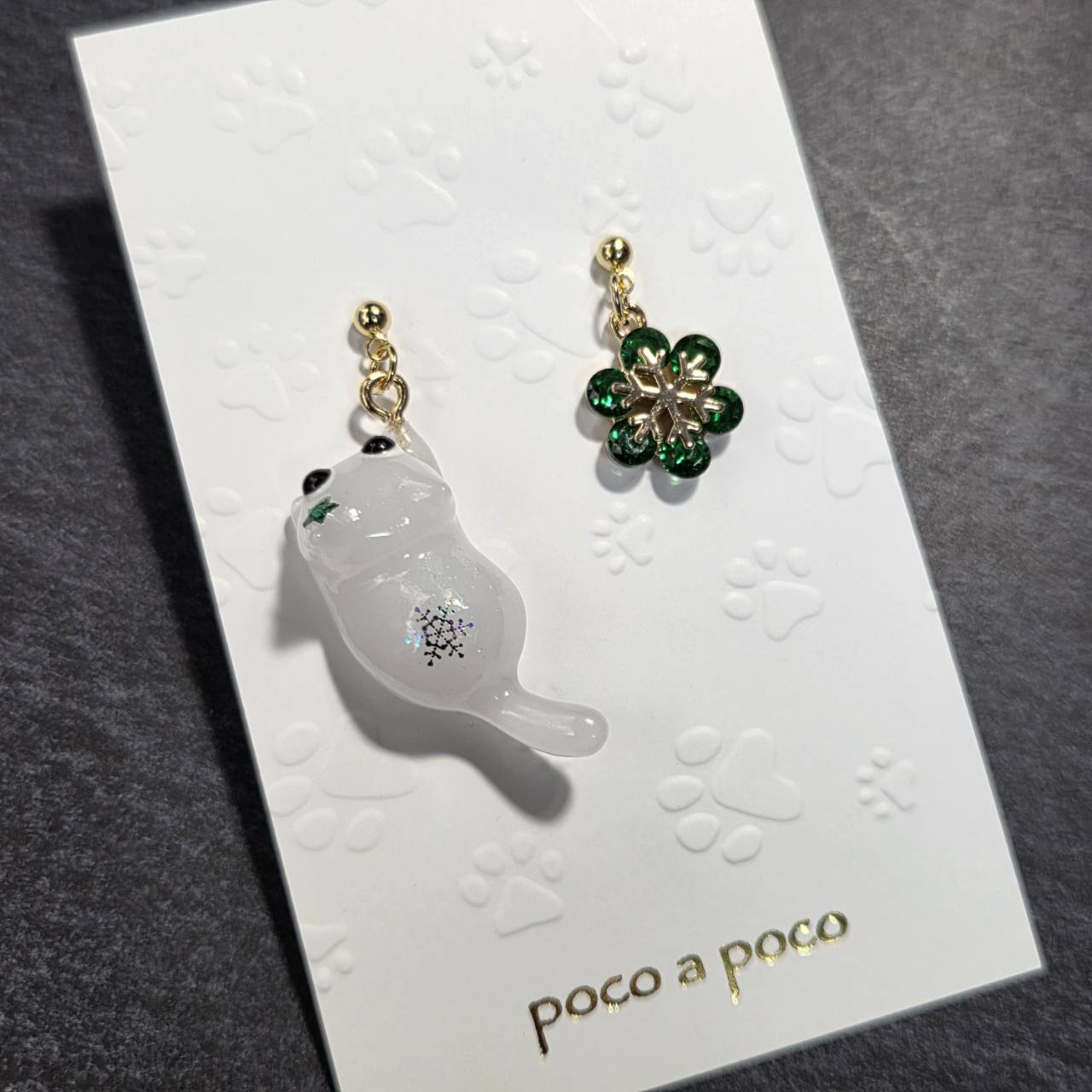 【受注販売】ピアス&イヤリング❉クリスマスの白猫❉エメラルドグリーンの雪の結晶のチャーム付き