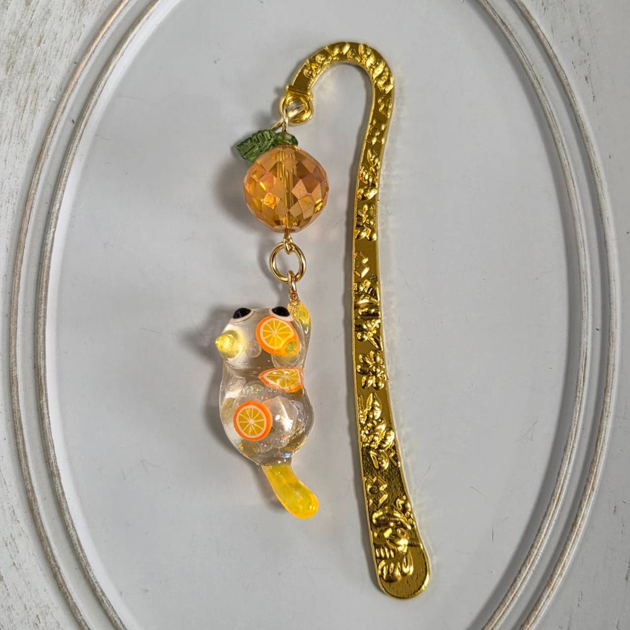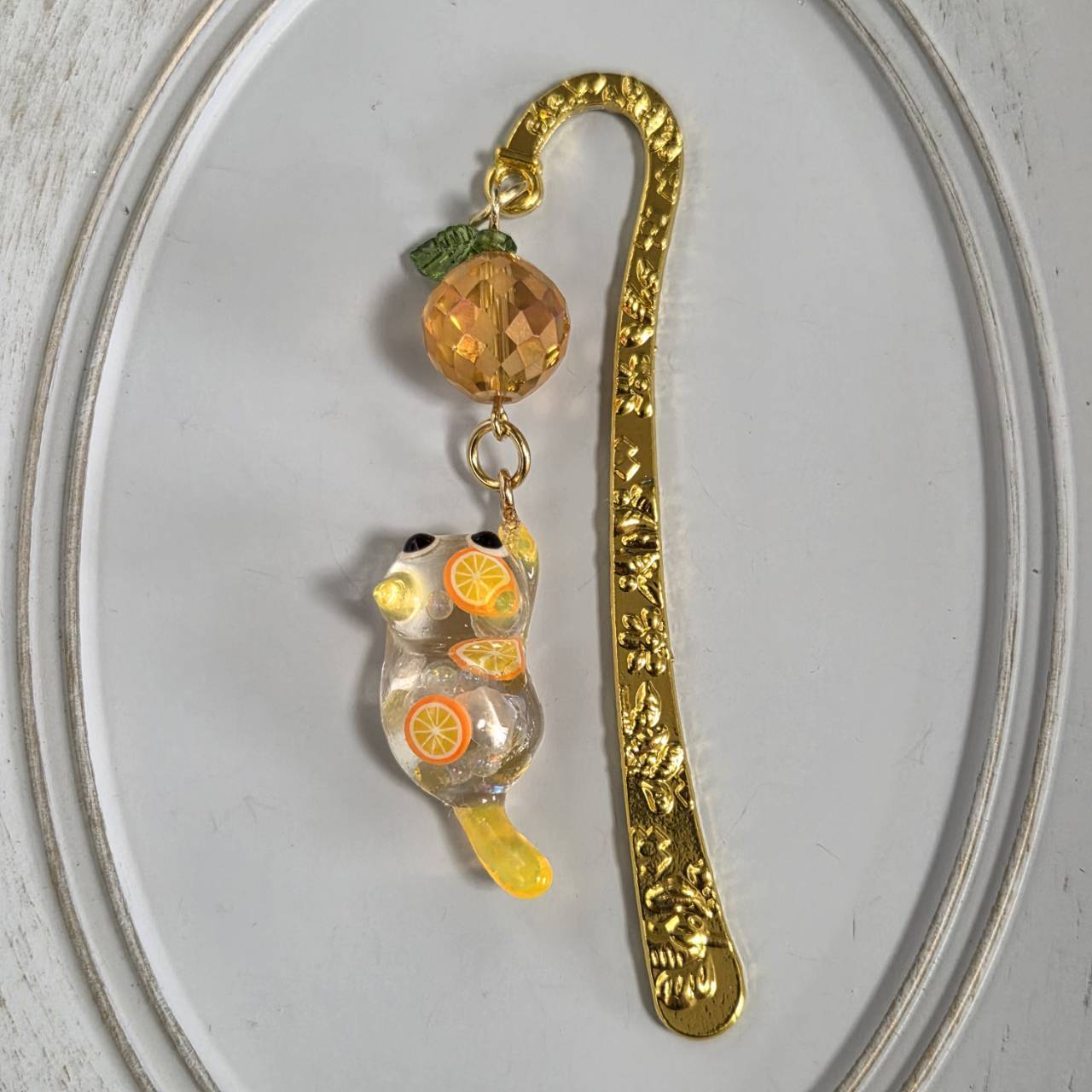 【受注販売】ニャンタオレンジのブックマーカー❉多面カットガラスのオレンジのチャーム付き