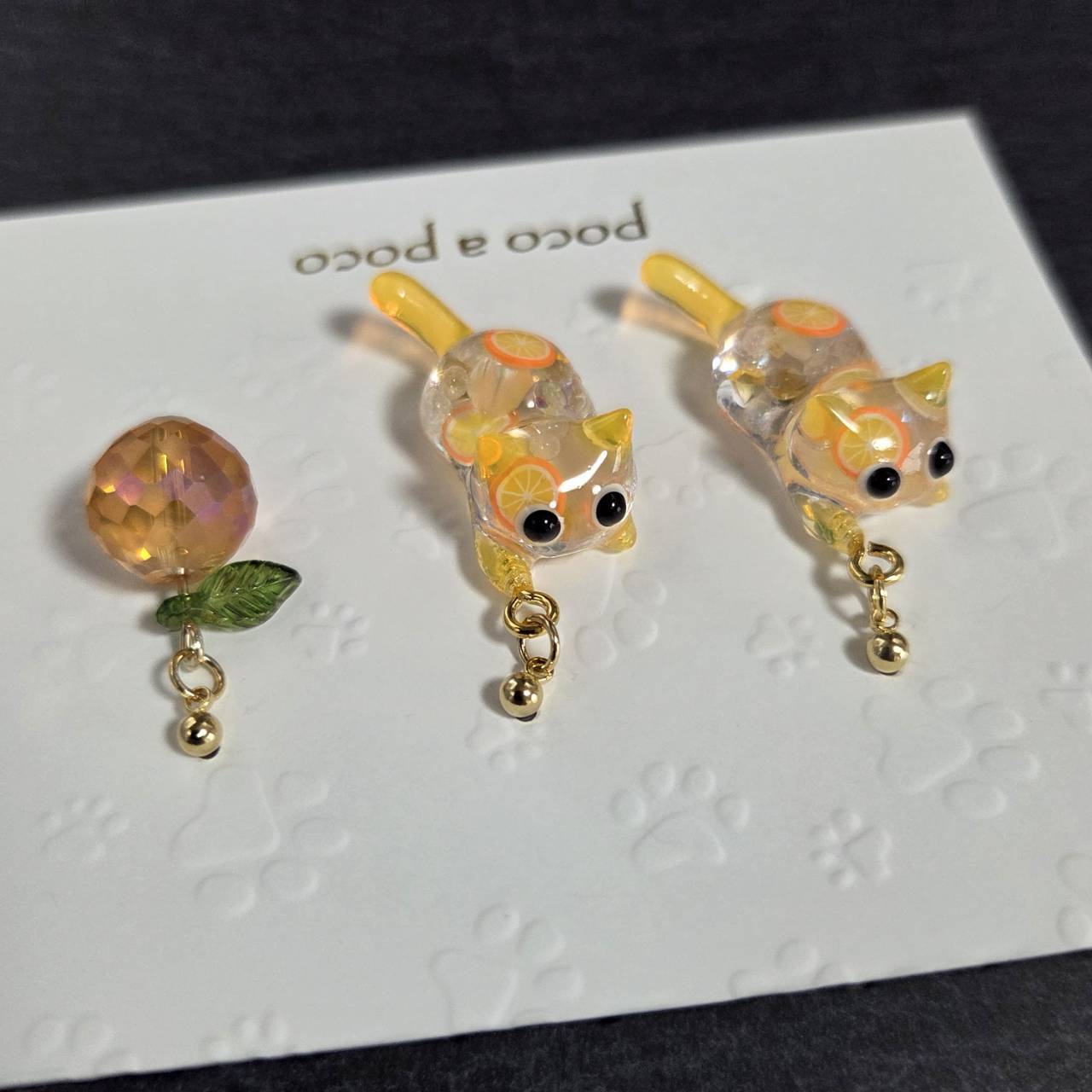 【受注販売】ピアス❉ニャンタオレンジ2匹と多面カットガラスのオレンジのチャーム
