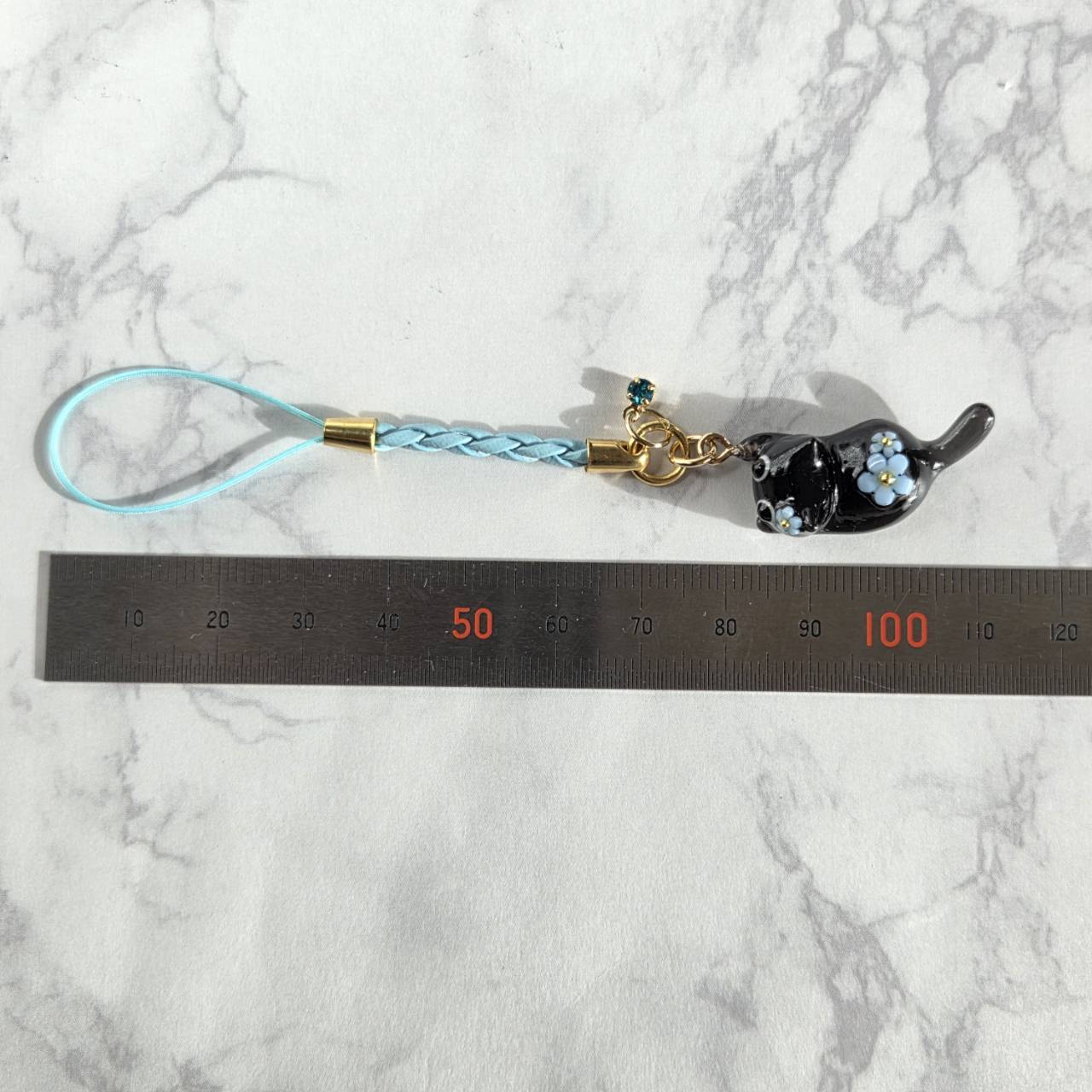ブルーのストラップにぶら下がった黒猫が青い水色のお花を纏っています。
