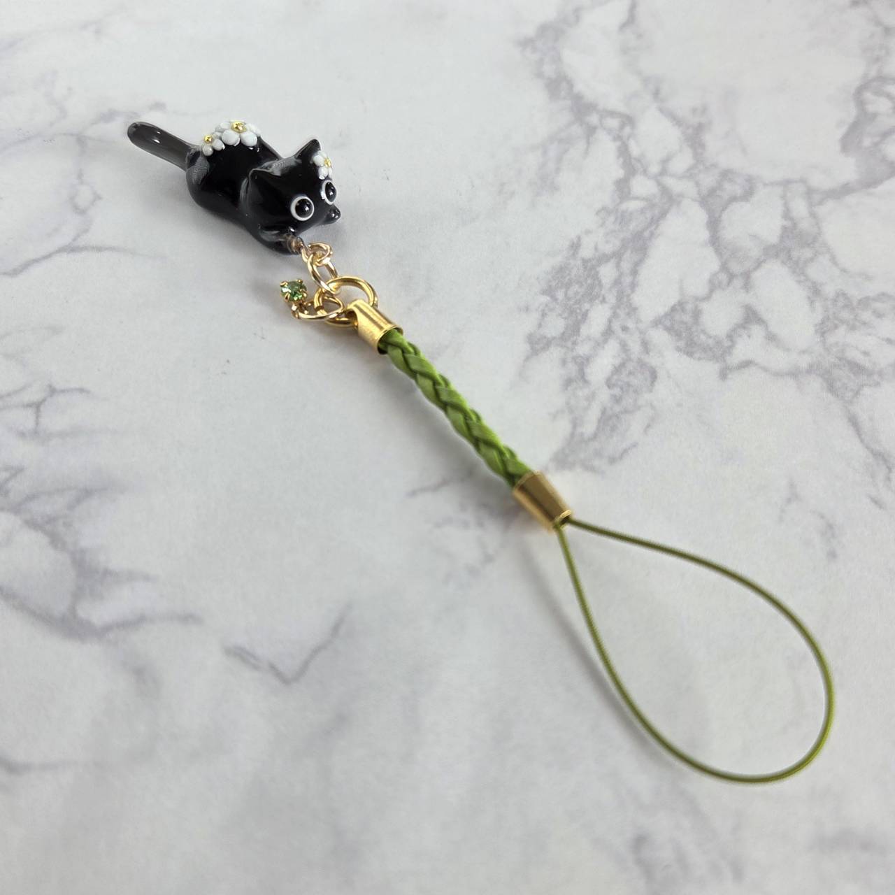 グリーンのストラップにぶら下がった黒猫が淡いグリーンのお花を纏っています。