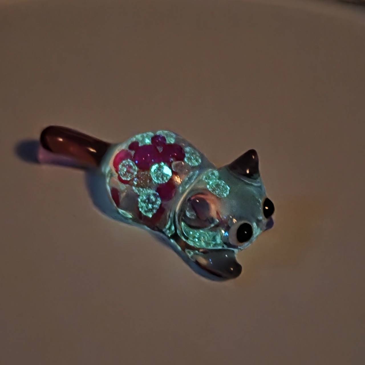 ねこちゃんの中にはグレープをイメージしたパープルのブリオンや蓄光ブリオンが詰め込まれているので、暗い所でも光ります。