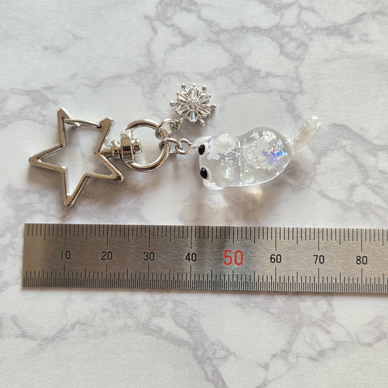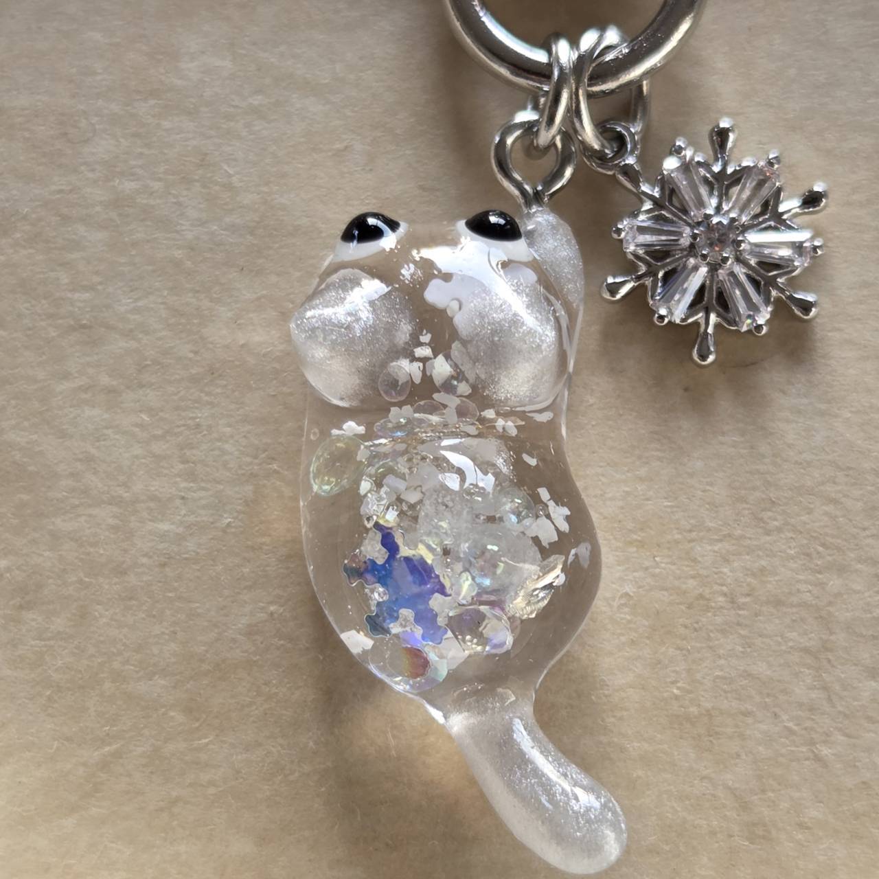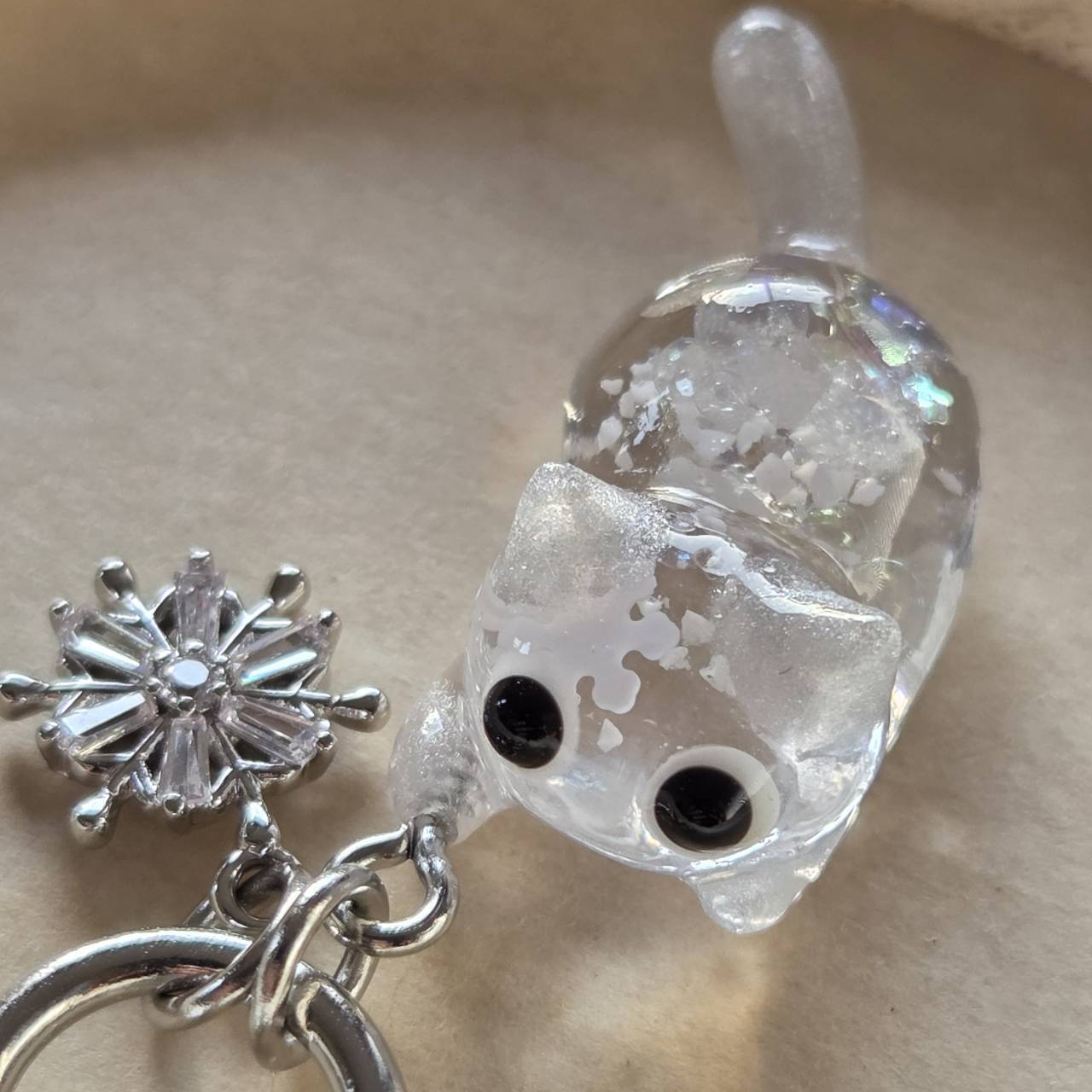 【受注販売】銀の雪にゃんのキーホルダー❉シルバーの雪の結晶のチャーム付き