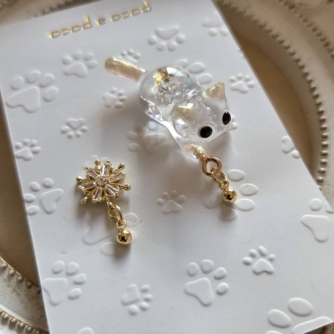 ❉ねこちゃんに入っているゴールドのスノーフレークの形はランダムになります。