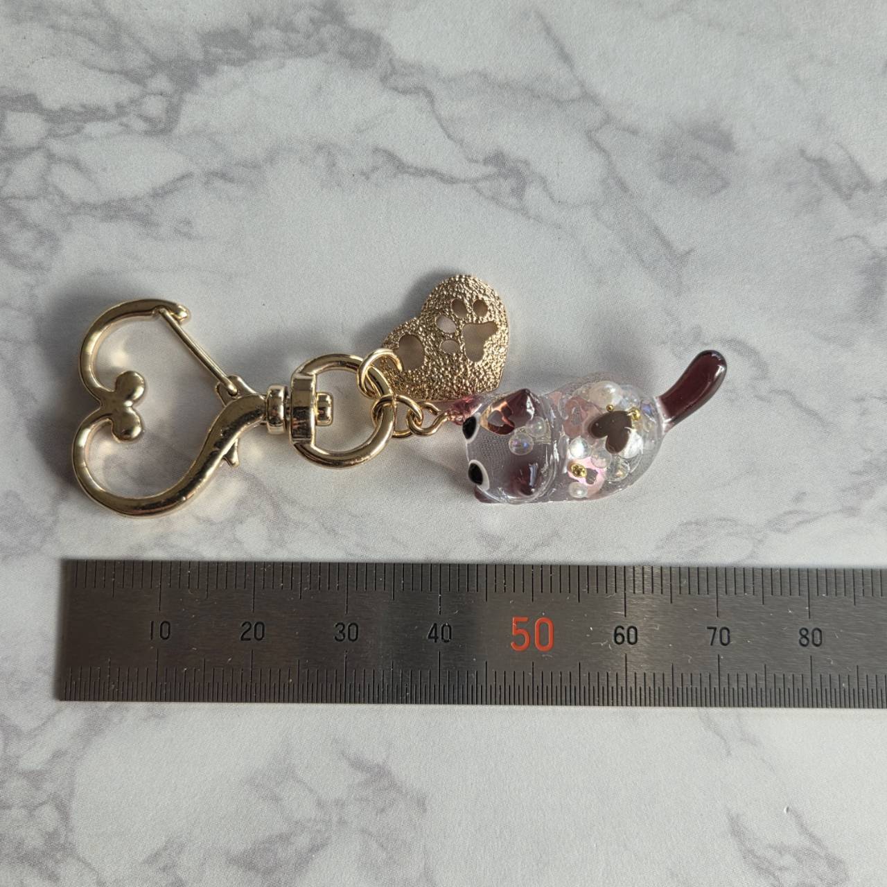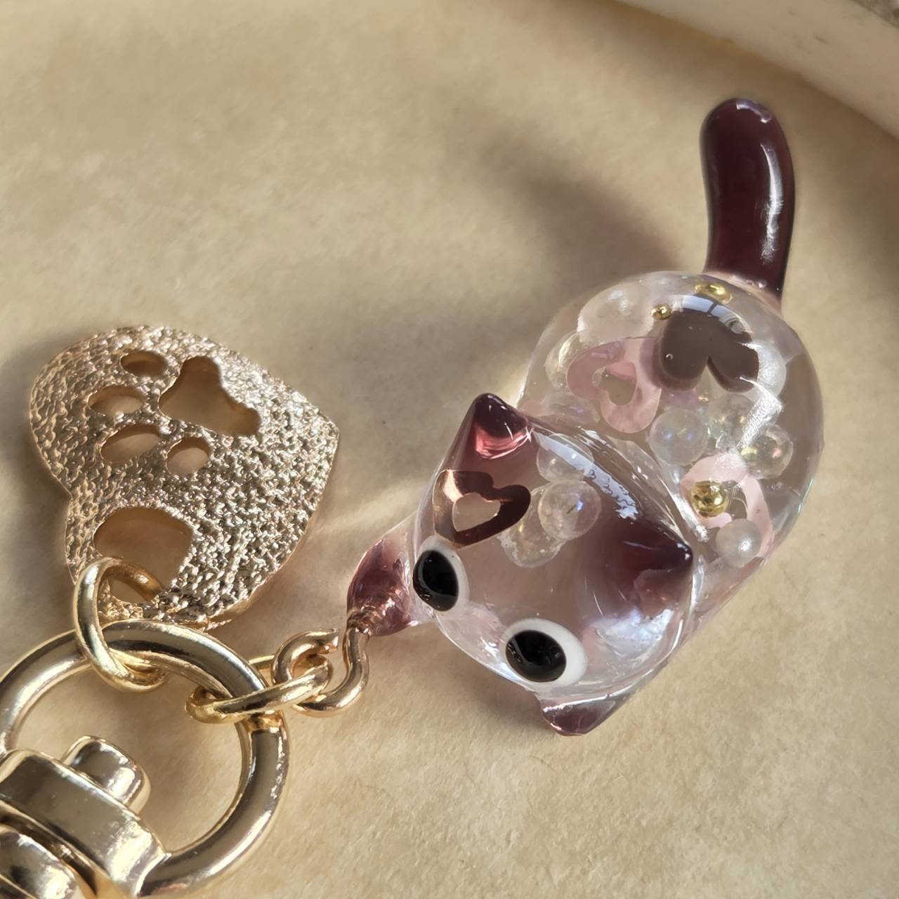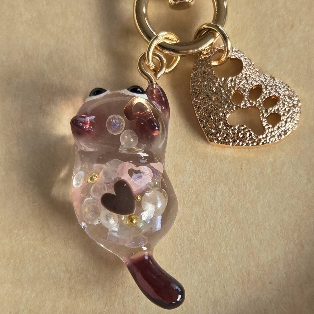肉球がくり抜かれたエンボス加工のゴールドのハート型チャームをお付けしました。