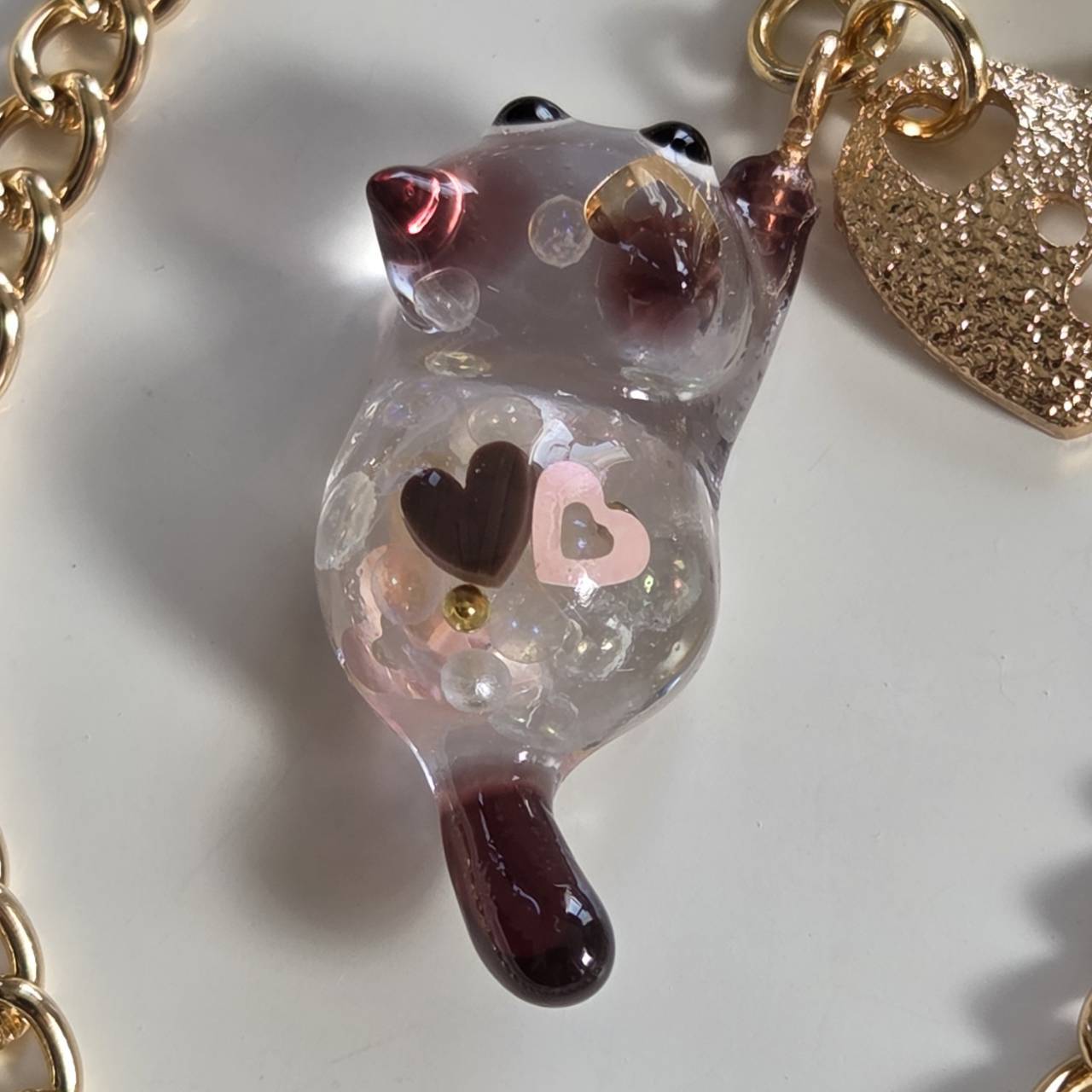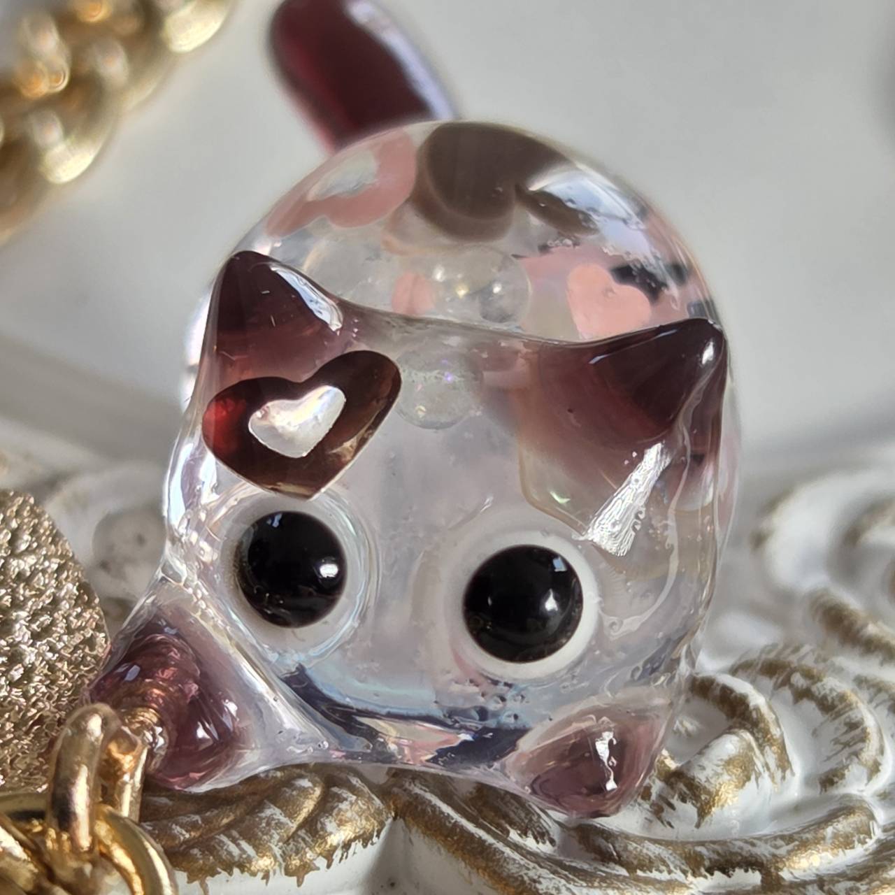ねこちゃんの中にはハートやパール、キラキラのブリオンが詰め込まれています。