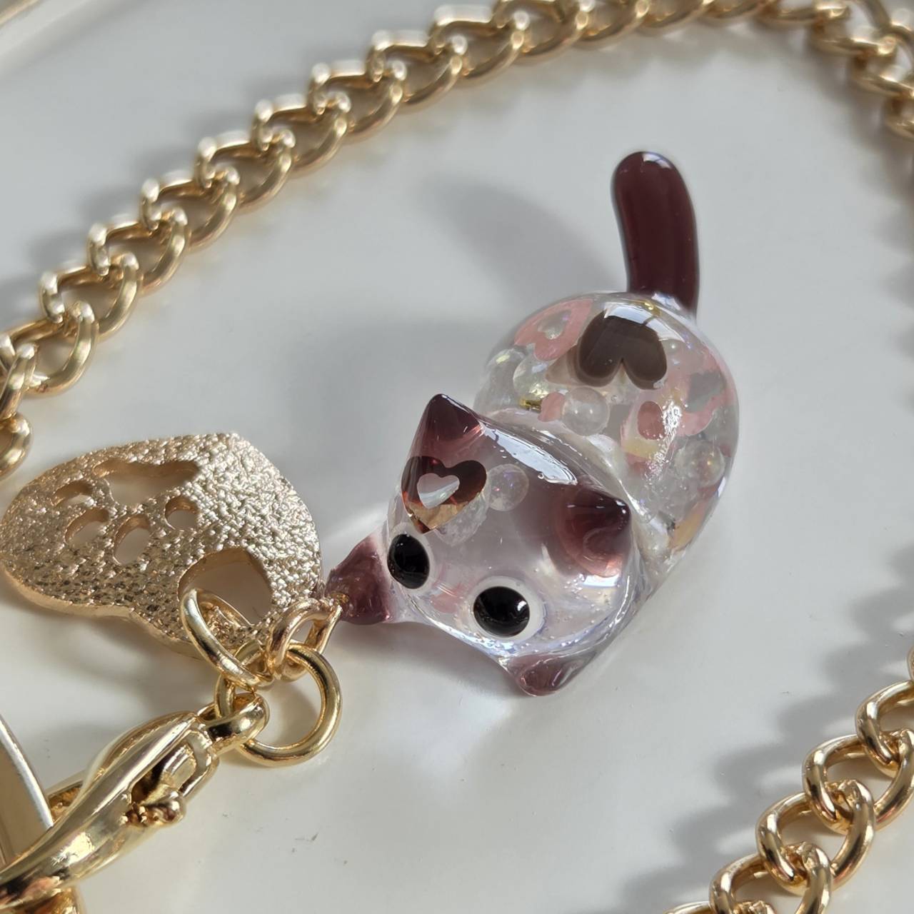 肉球がくり抜かれたエンボス加工のゴールドのハート型チャームをお付けしました。