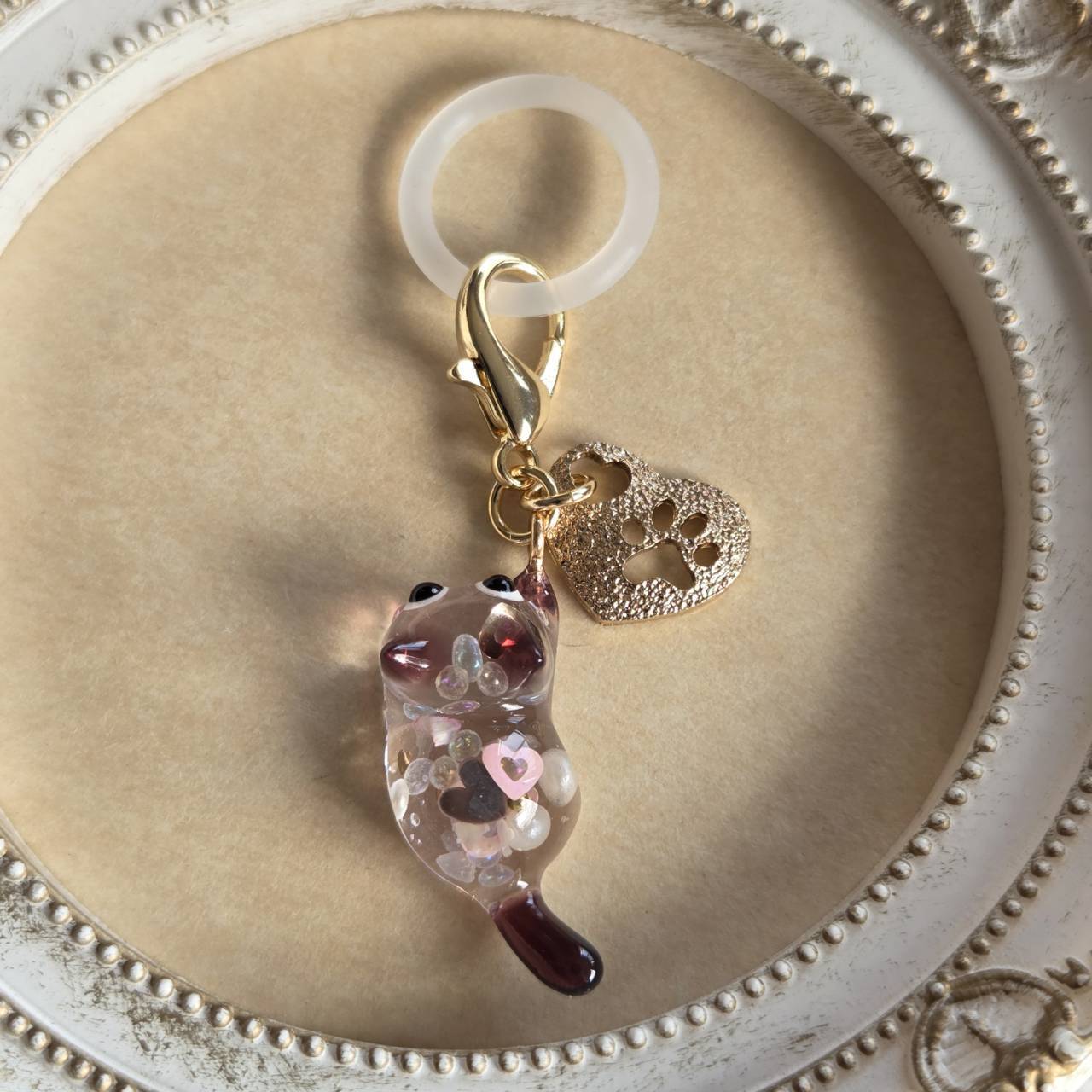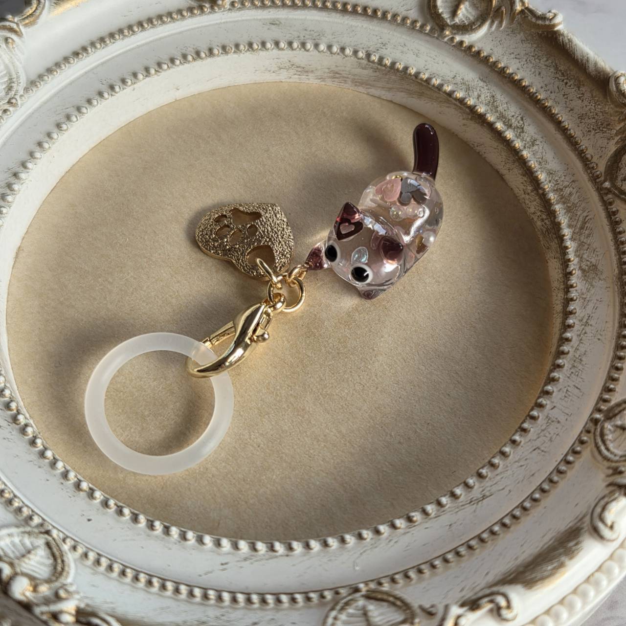 肉球がくり抜かれたエンボス加工のゴールドのハート型チャームをお付けしました。
