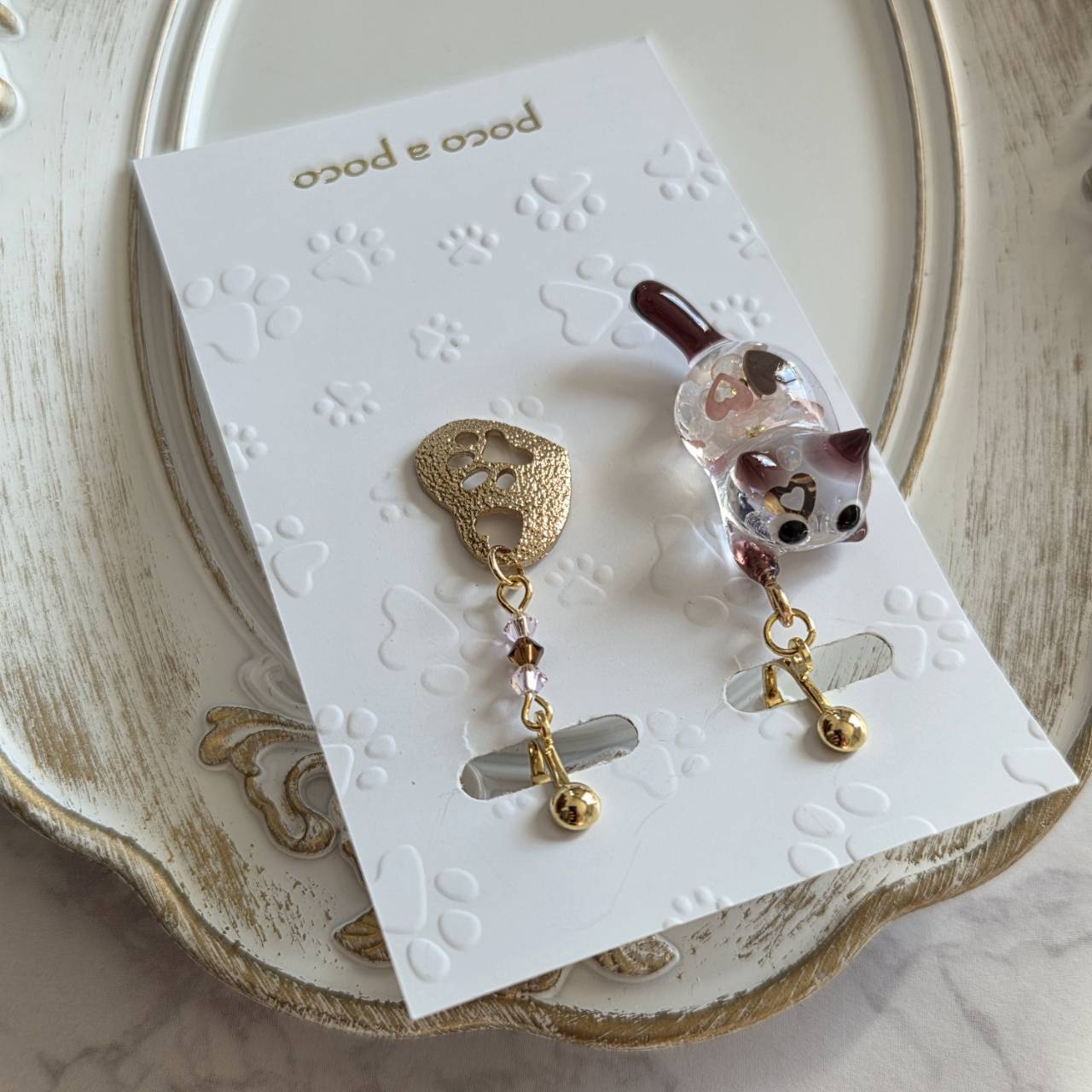 もう片方はピンクとブラウンのクリスタルビーズに肉球がくり抜かれたエンボス加工のゴールドのハート型チャームをお付けしました。