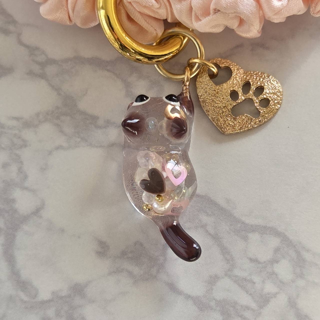 肉球がくり抜かれたエンボス加工のゴールドのハート型チャームをお付けしました。