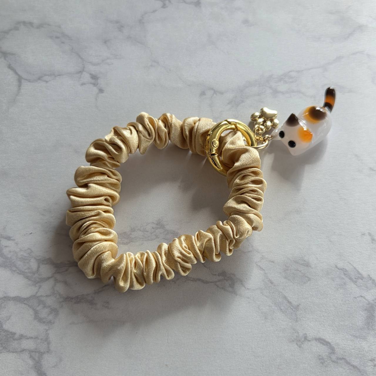 【受注販売】ミケ猫のキャラメルシュシュ(ゴールド)❉肉球のチャーム付き