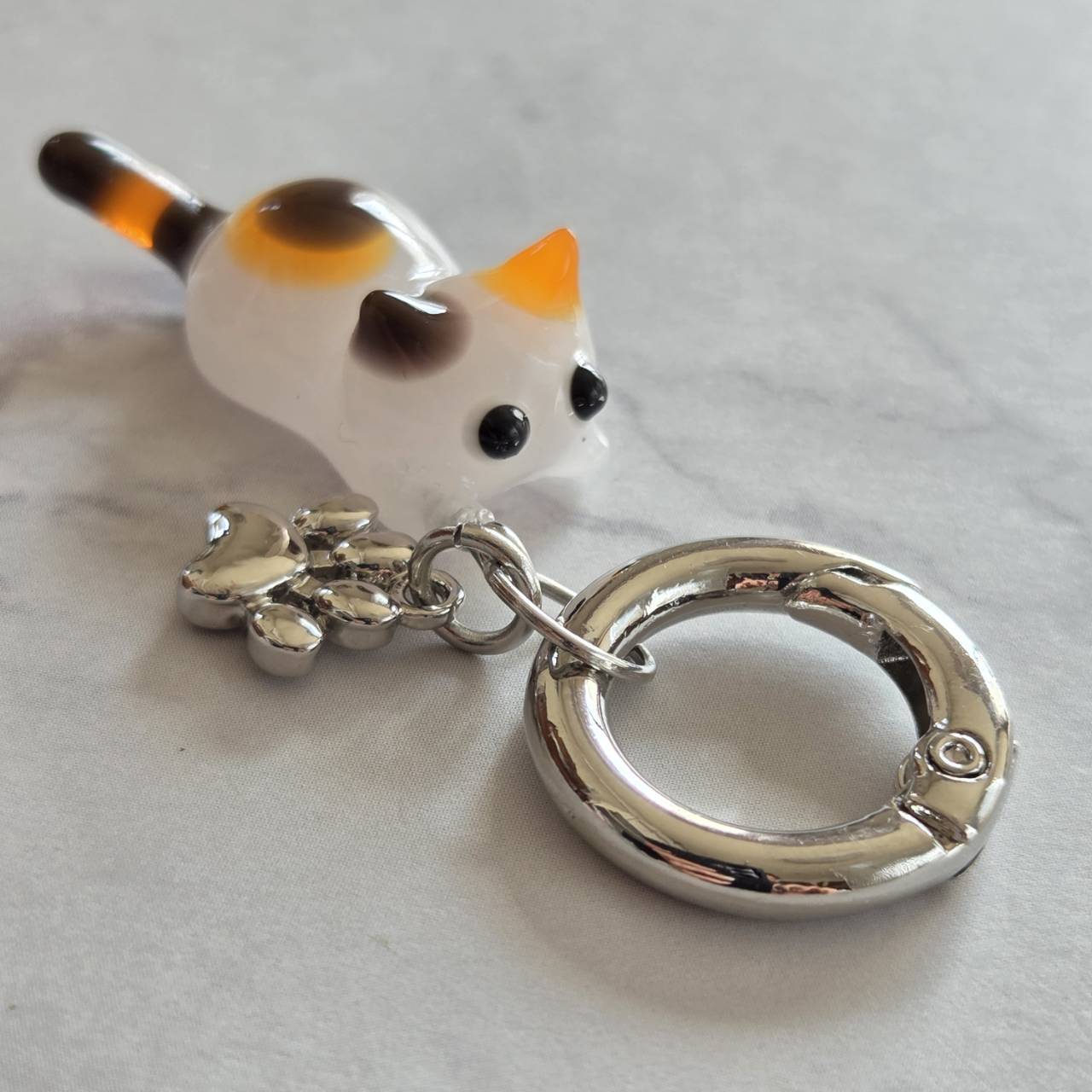 ねこちゃんと肉球チャームは丸型のカラビナで取り付けてありますので、簡単に取り外すことが可能です。