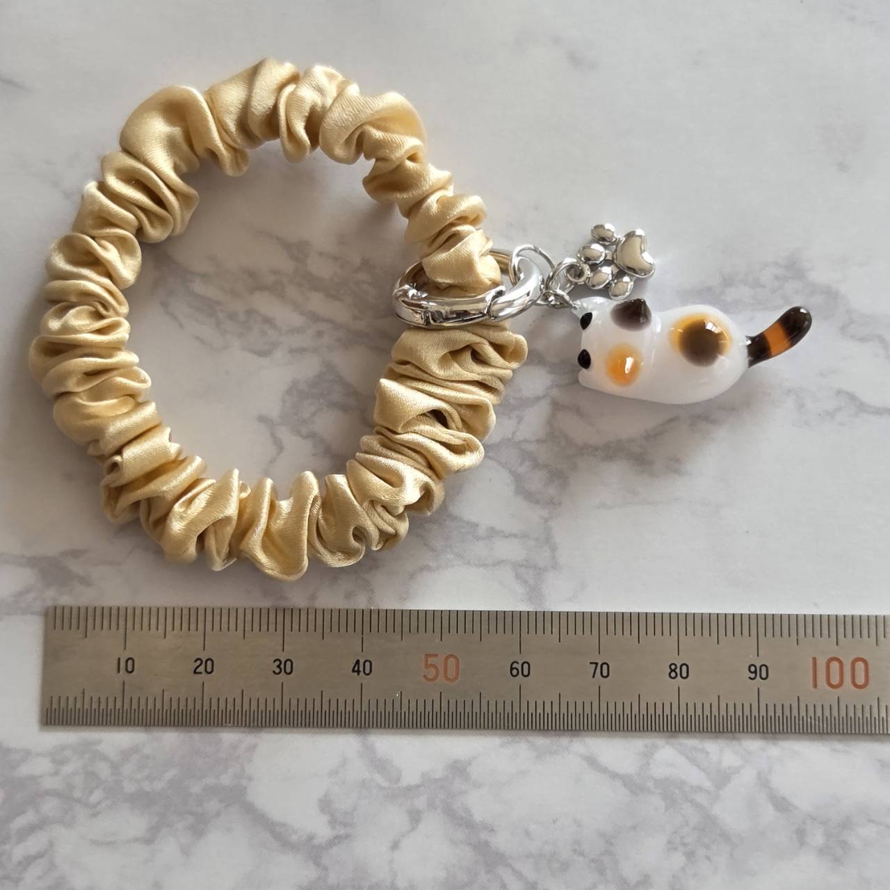 【受注販売】ミケ猫のキャラメルシュシュ(シルバー)❉肉球のチャーム付き