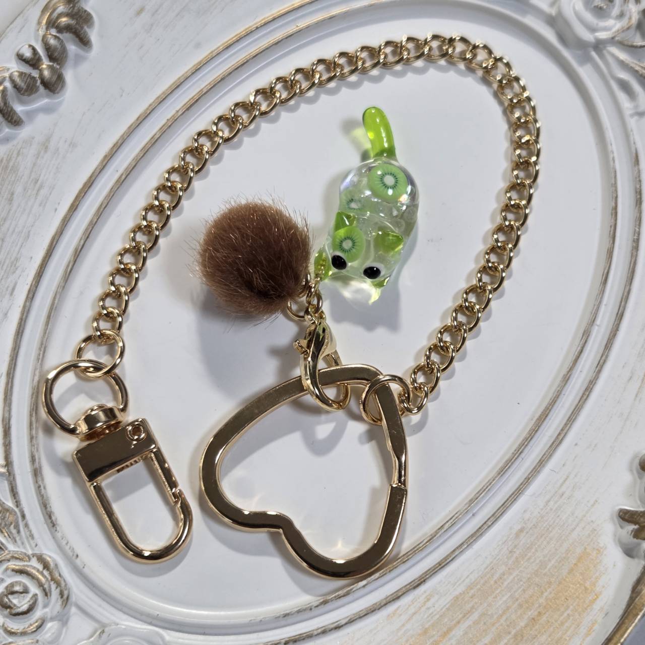 【受注販売】キウイにゃんこのバッグチャーム❉ブラウンのファーボール付き
