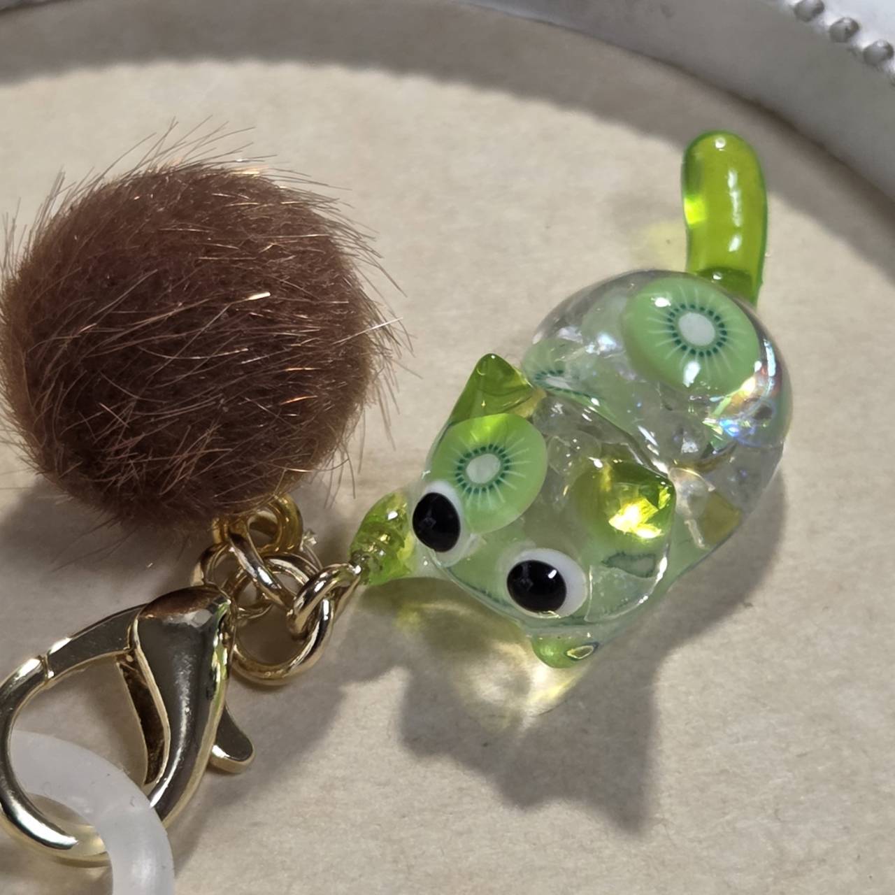 ねこちゃんの中にはキウイの輪切りにブリオン、ビジューや蓄光ブリオンが詰め込まれているので、暗い所でも光ります。