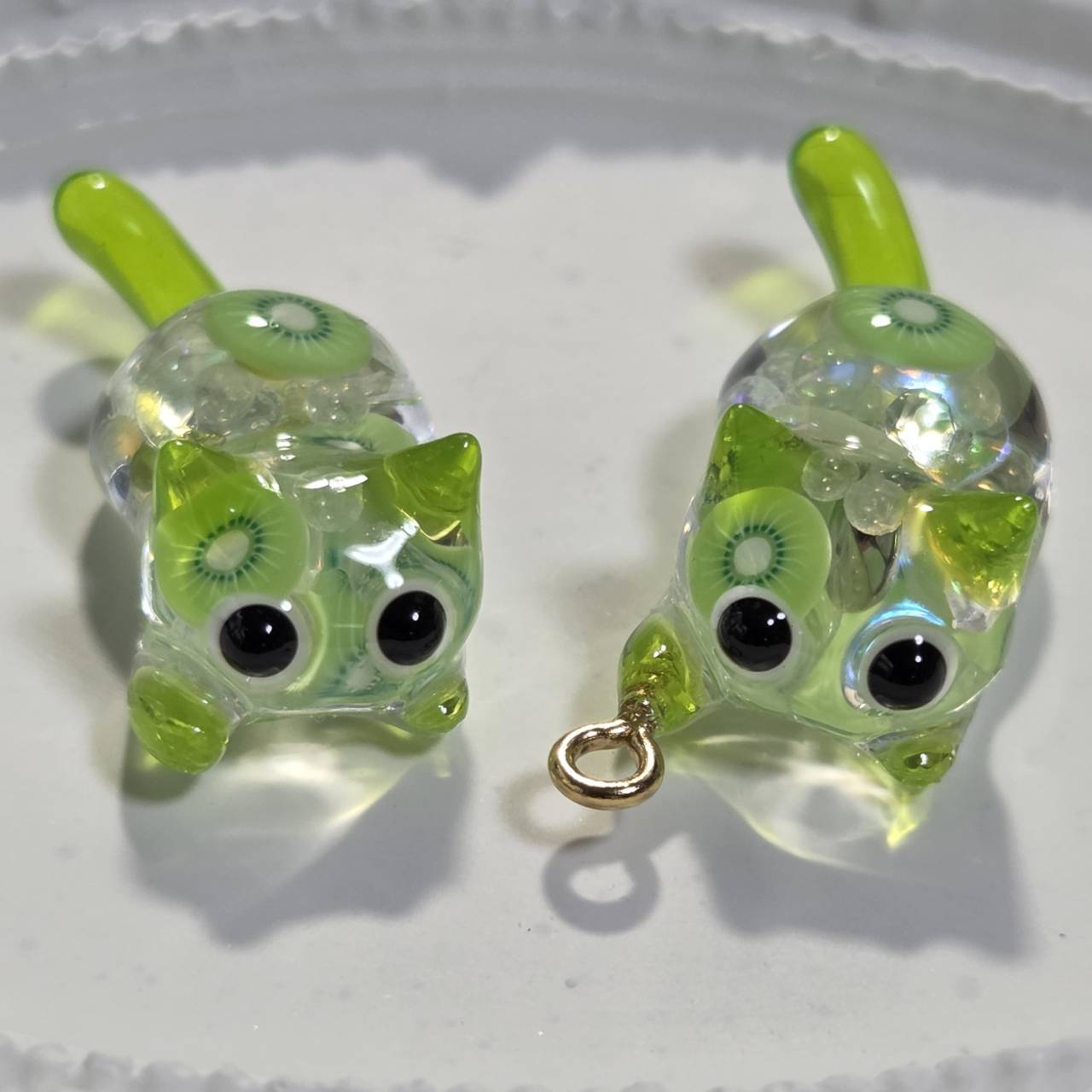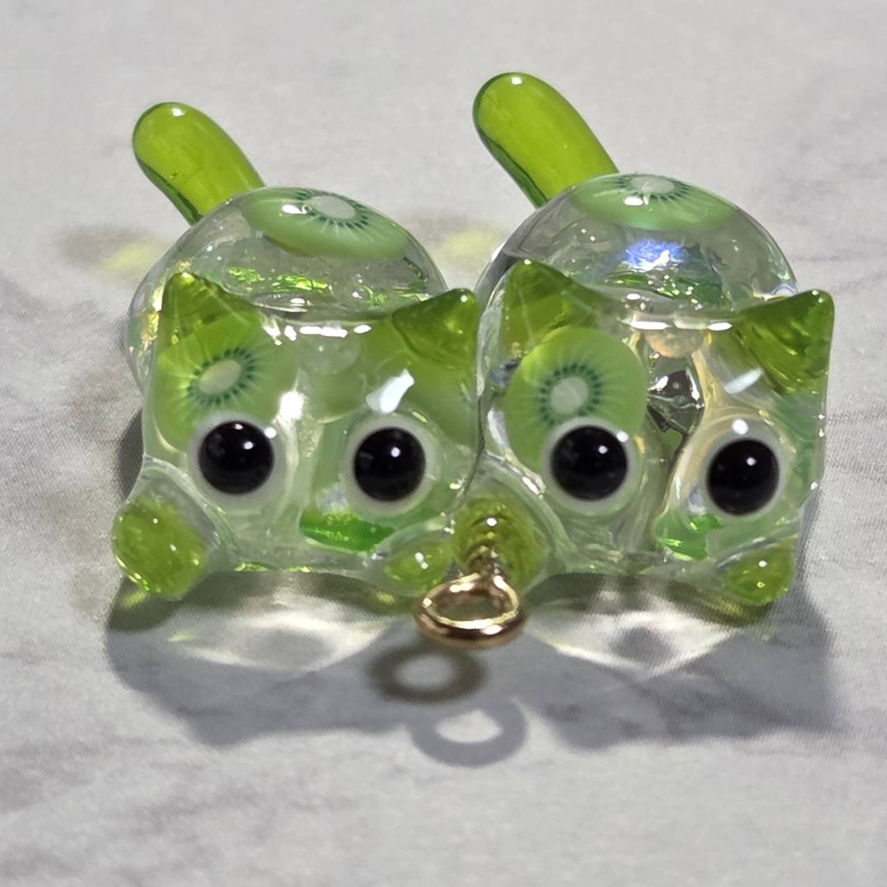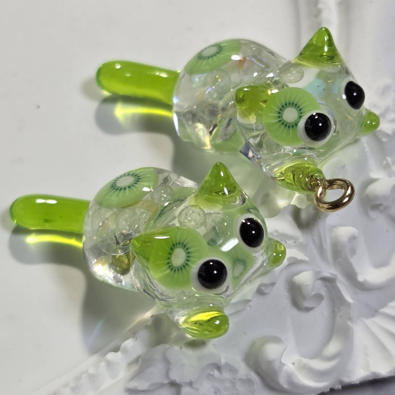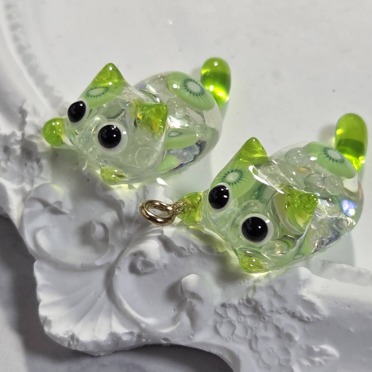 ねこちゃんの中にはキウイの輪切りにブリオン、ビジューや蓄光ブリオンが詰め込まれているので、暗い所でも光ります。