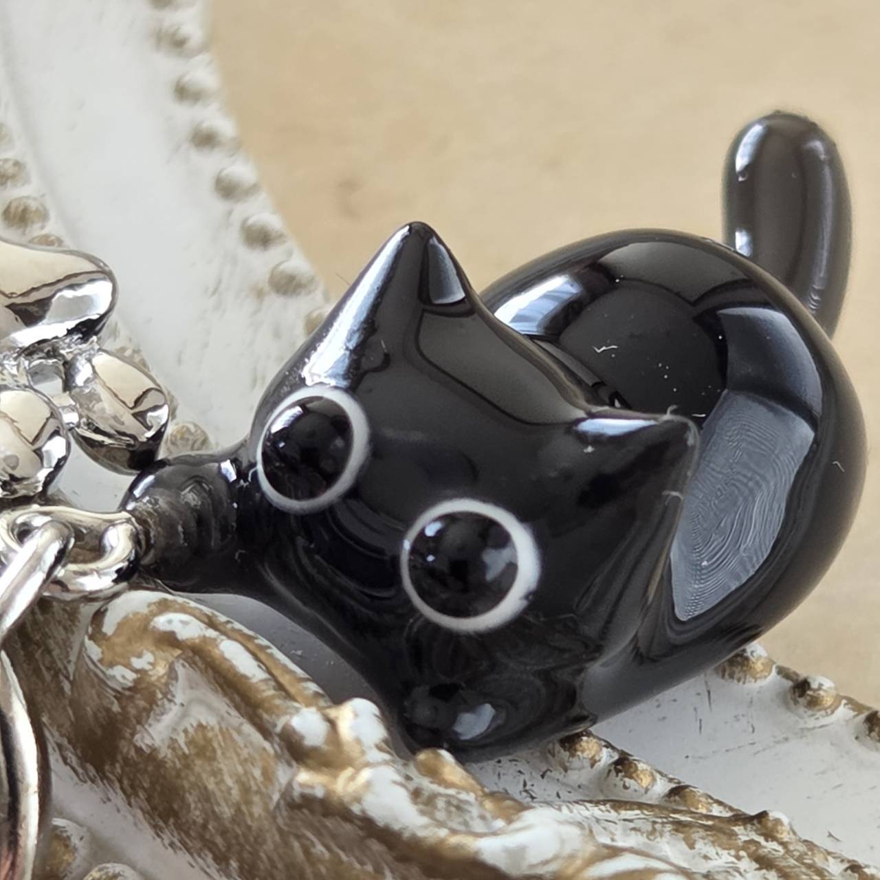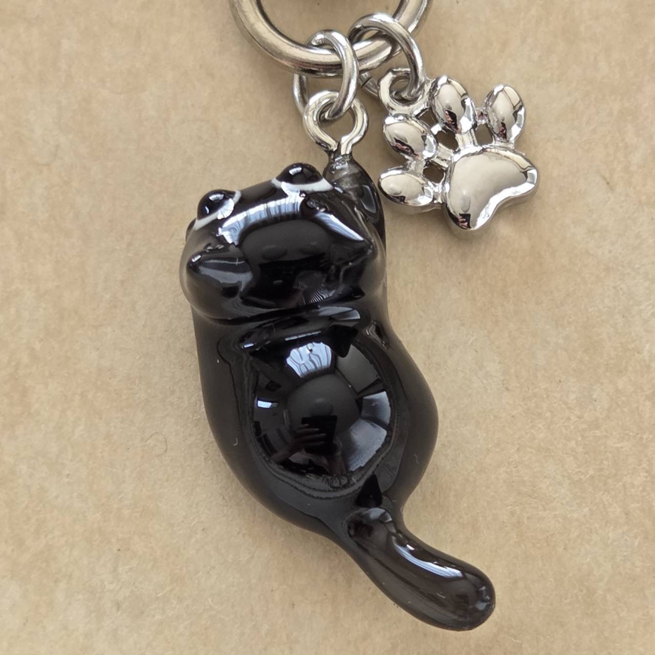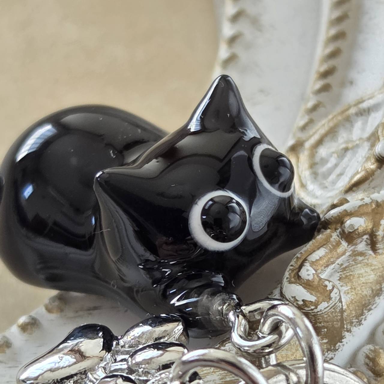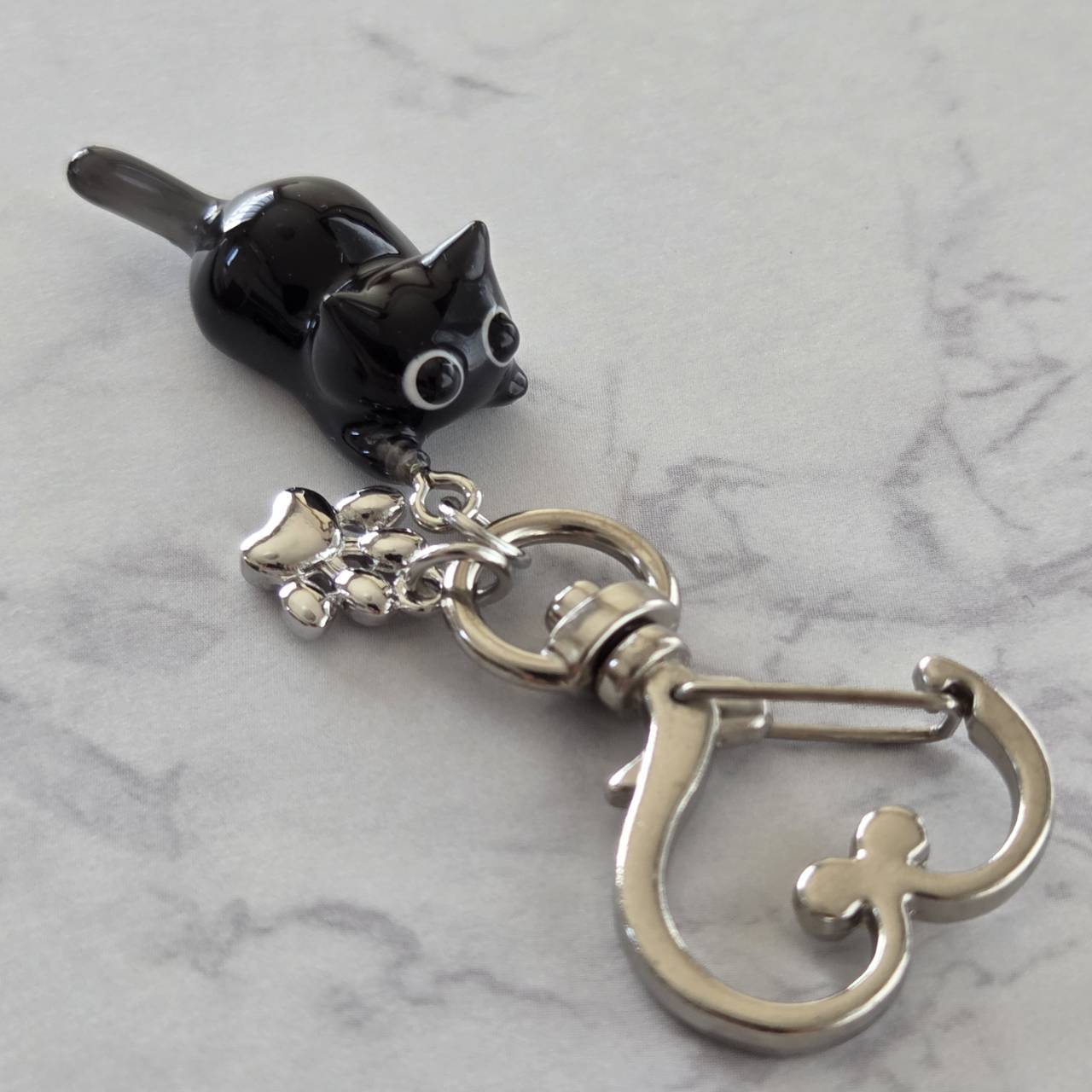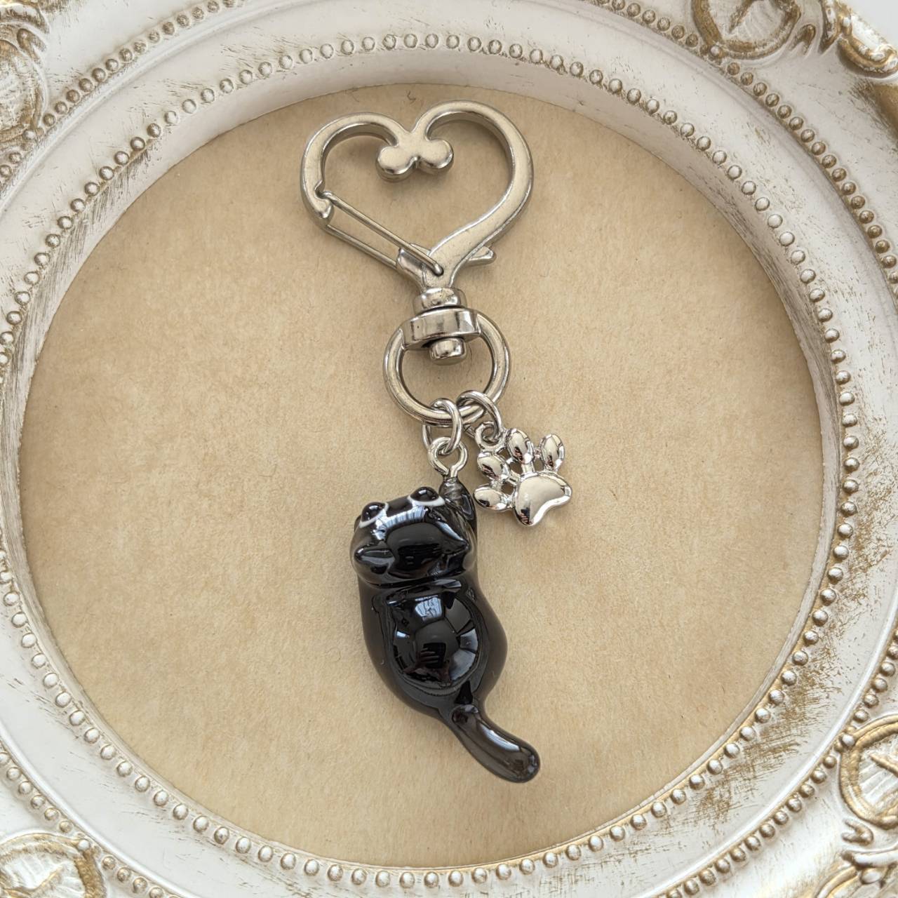 【受注販売】黒猫のハートキーホルダー(シルバー)❉肉球のチャーム付き