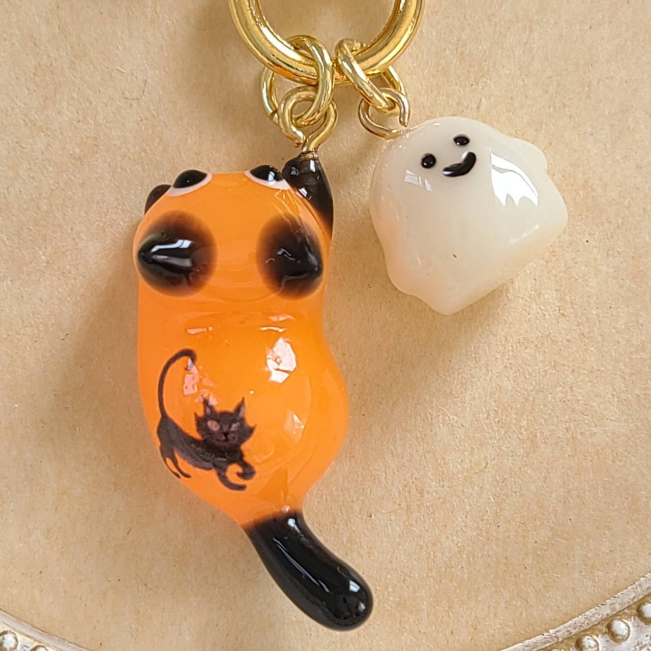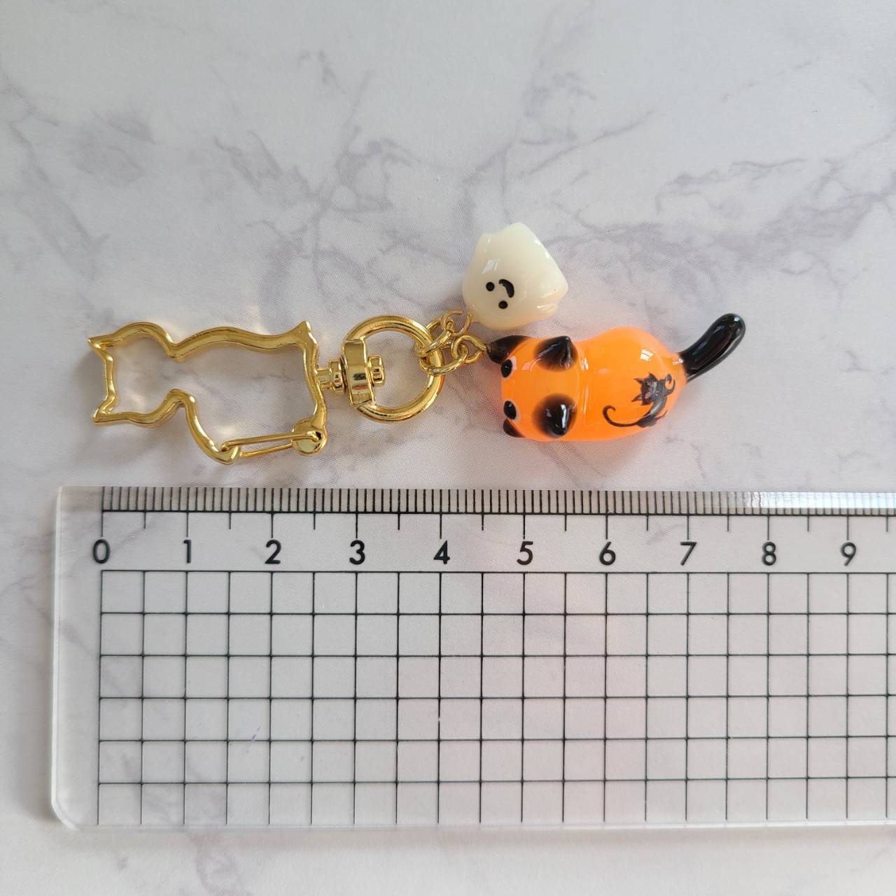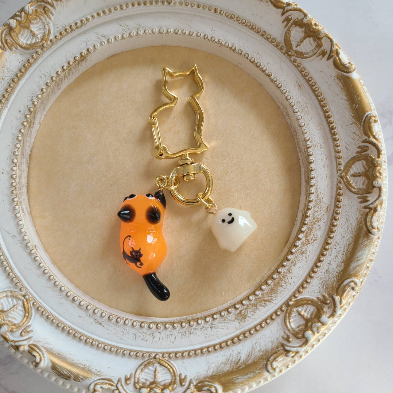 【2匹限定販売】蓄光で光る!黒猫柄のオレンジのハロウィンにゃんこのキーホルダー❉白いオバケのチャーム付き