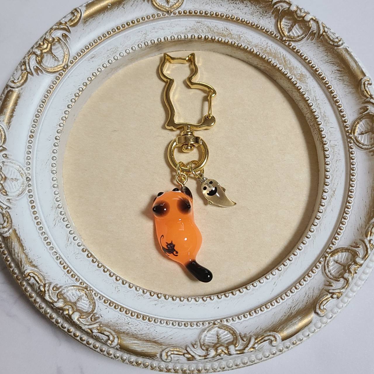 【2匹限定販売】蓄光で光る!黒猫柄のオレンジのハロウィンにゃんこのキーホルダー❉透明なオバケのチャーム付き