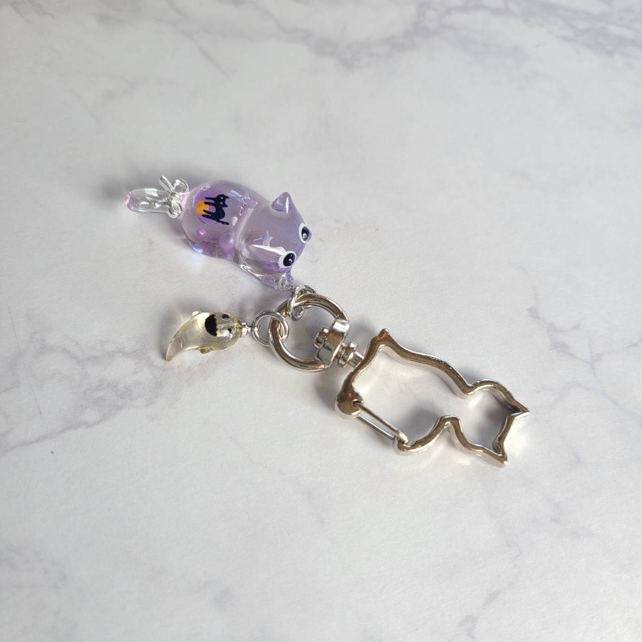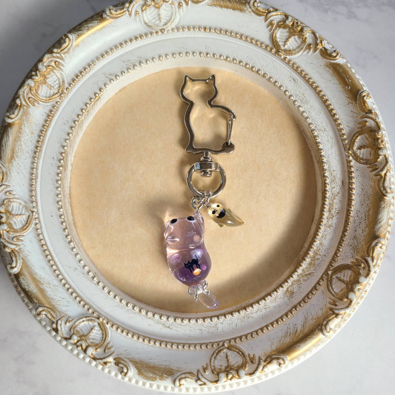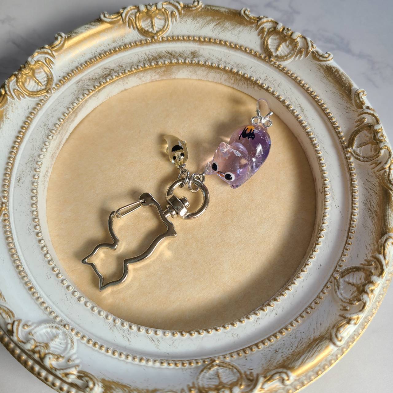 【46匹限定販売】ブラックライトで光る!淡いパープルのハロウィンにゃんこのキーホルダー❉透明なオバケのチャーム付き