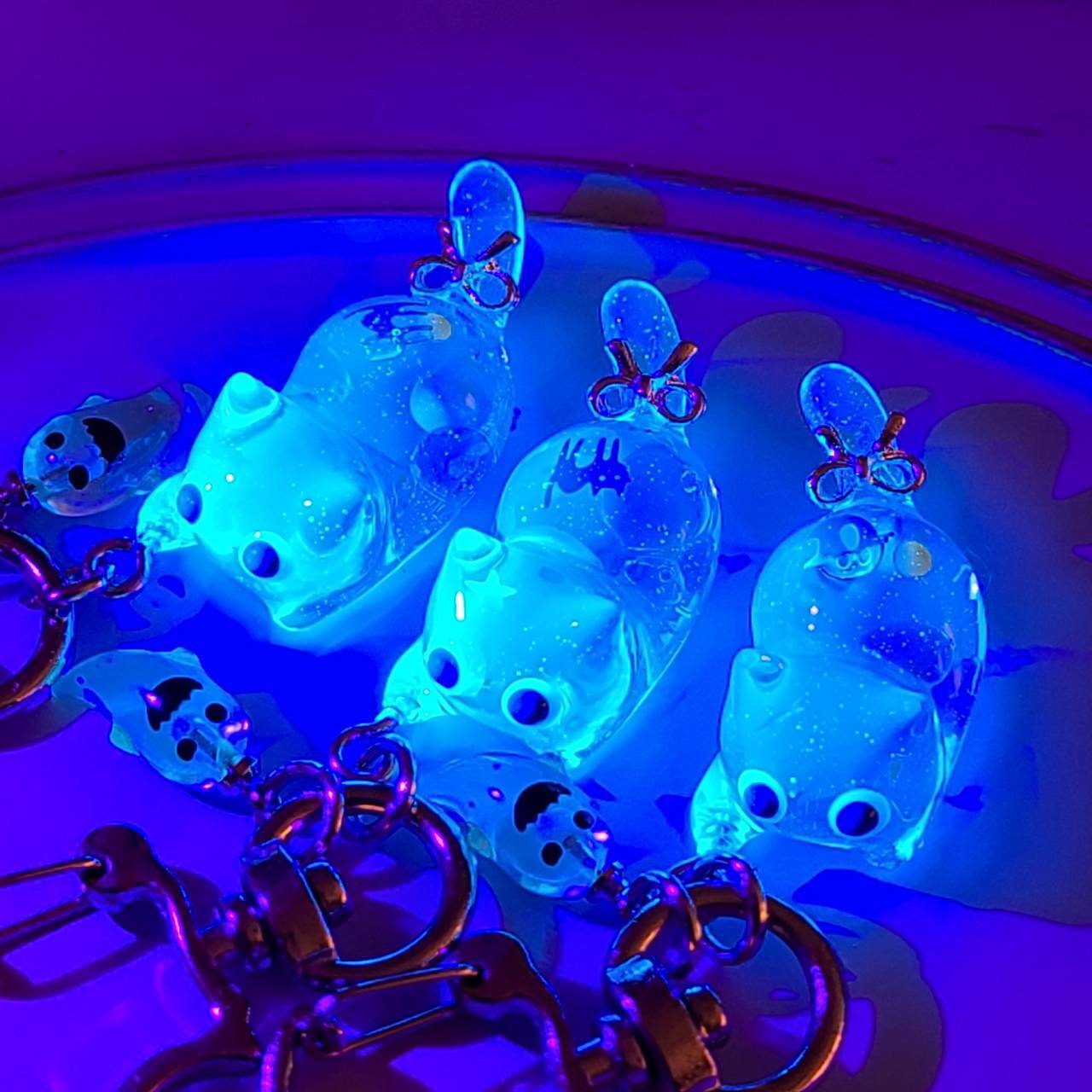 ねこちゃんはブラックライトやLED/UVライトを当てると青く光るレジン液で作っております✨