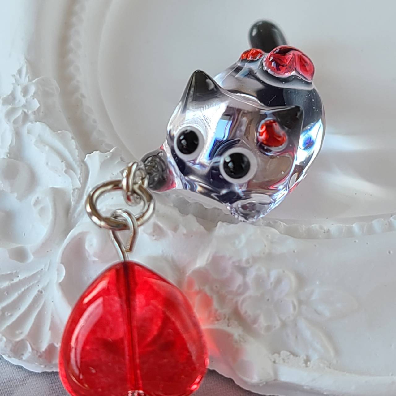 ブラックをポイントにしたクリアなネコちゃんがぷっくりした赤のハートを纏っています。