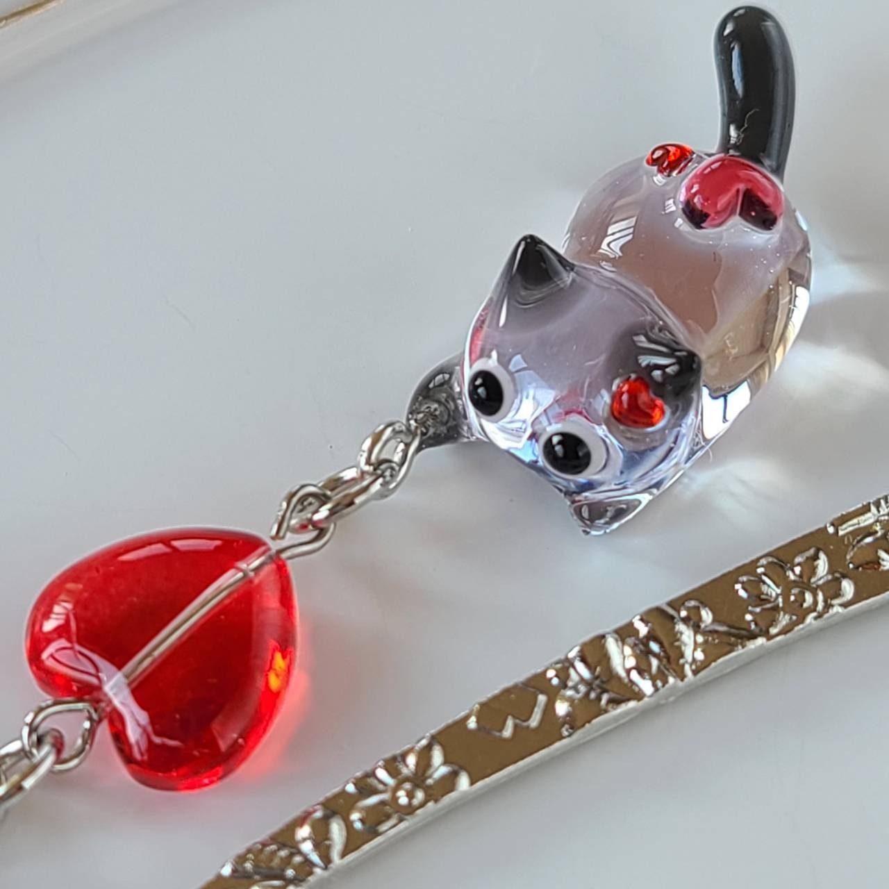 【10匹限定】ぷっくり赤のハートを纏ったブラックのネコのブックマーカー❉赤いハートのガラスビーズ付き