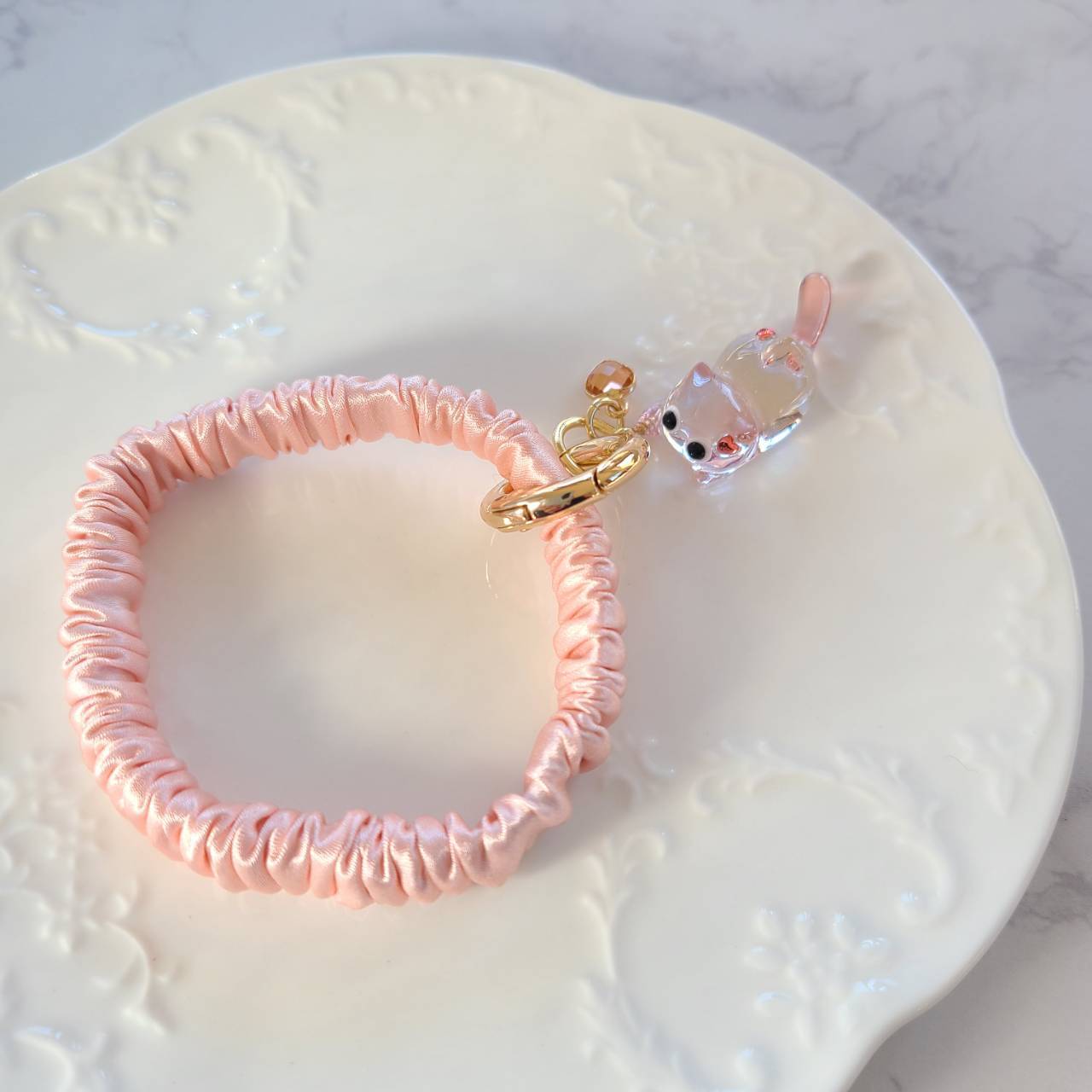 【1匹限定】ぷっくりピーチのハートを纏ったピンクのネコのシュシュ(あずきピンク)❉ピーチピンクのハート型のチャーム付き
