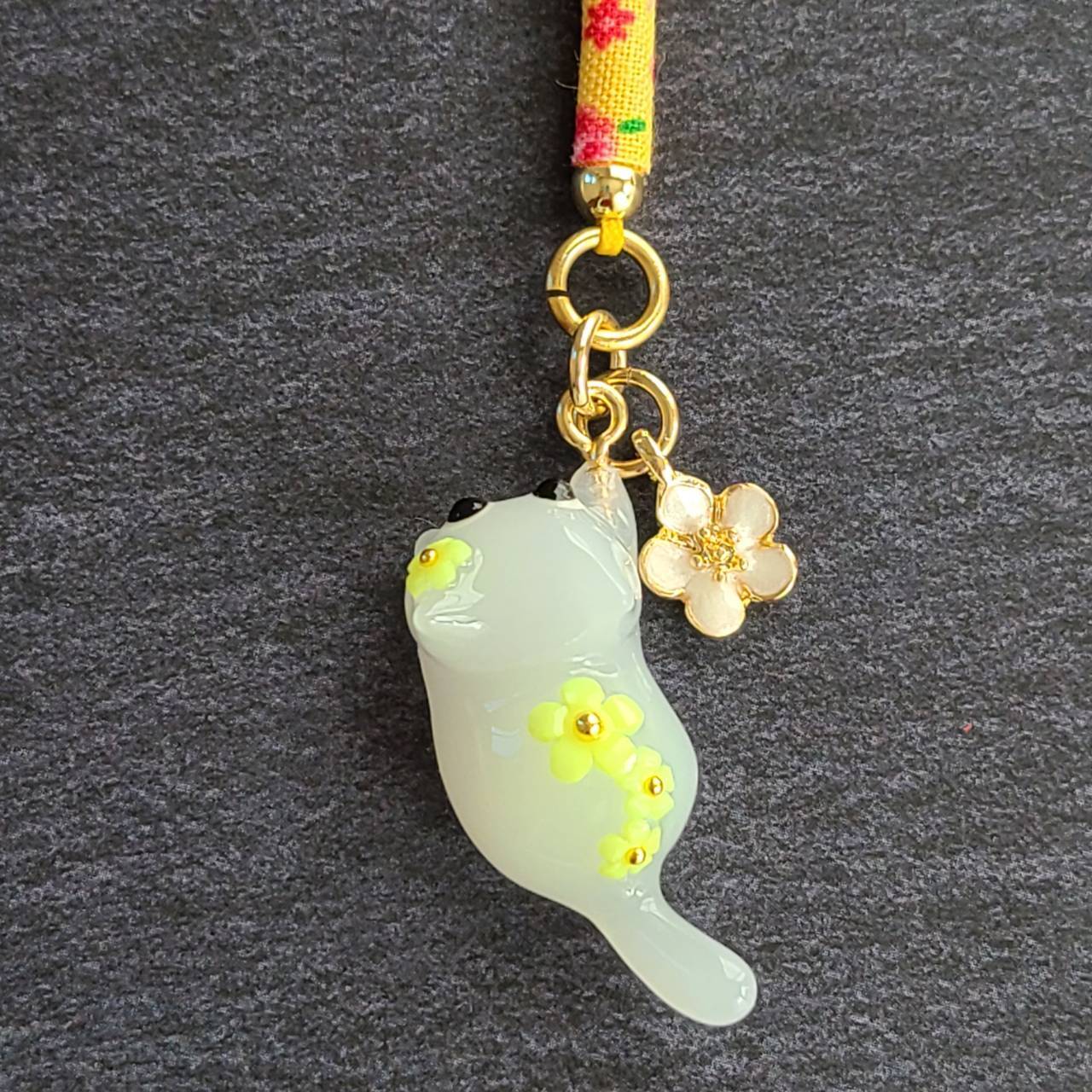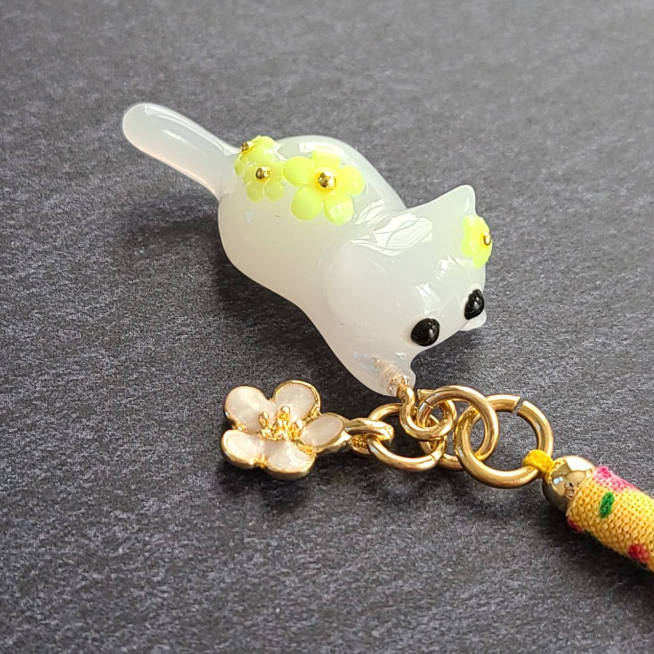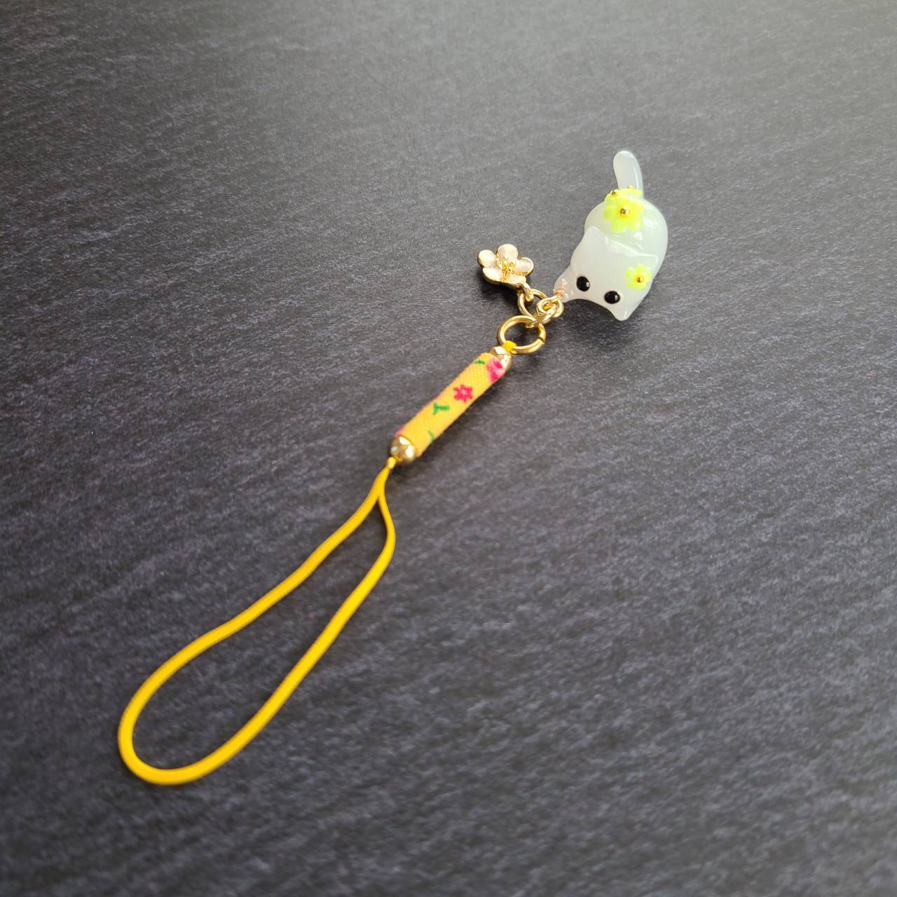 花柄の黄色いストラップにぶら下がる白猫ちゃんは推し色が黄色の人にオススメです。
