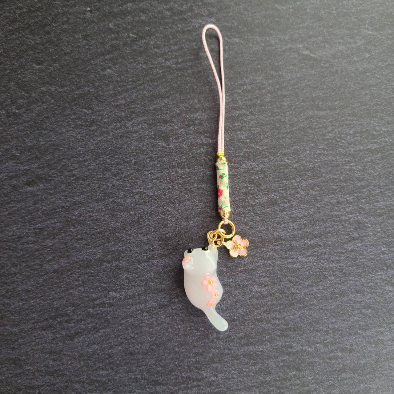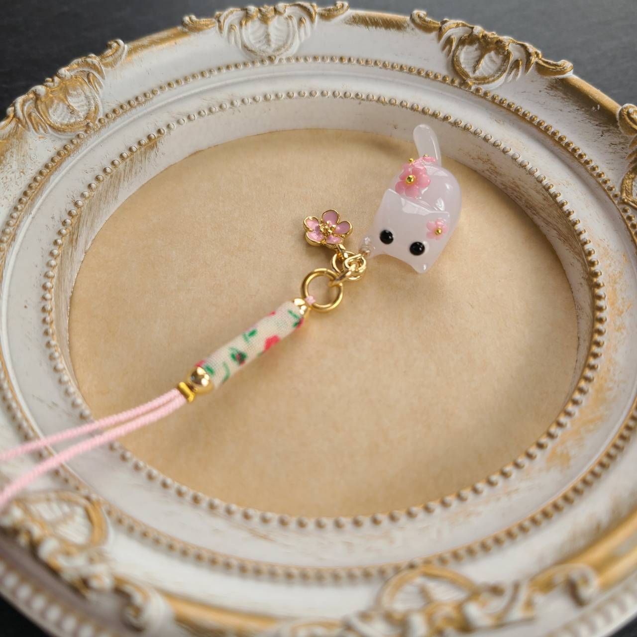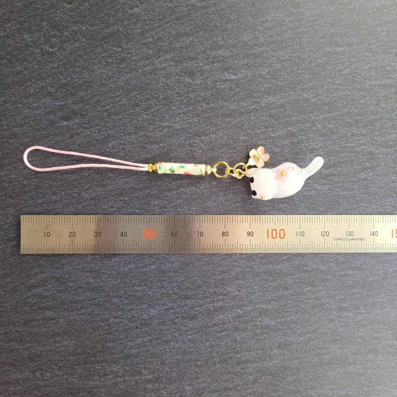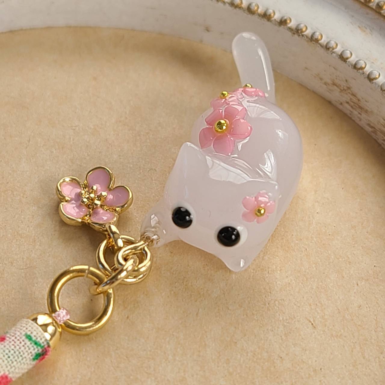 【受注再販】ピンクの花ざかりの白猫のストラップ❉ピンクの小花のチャーム付き